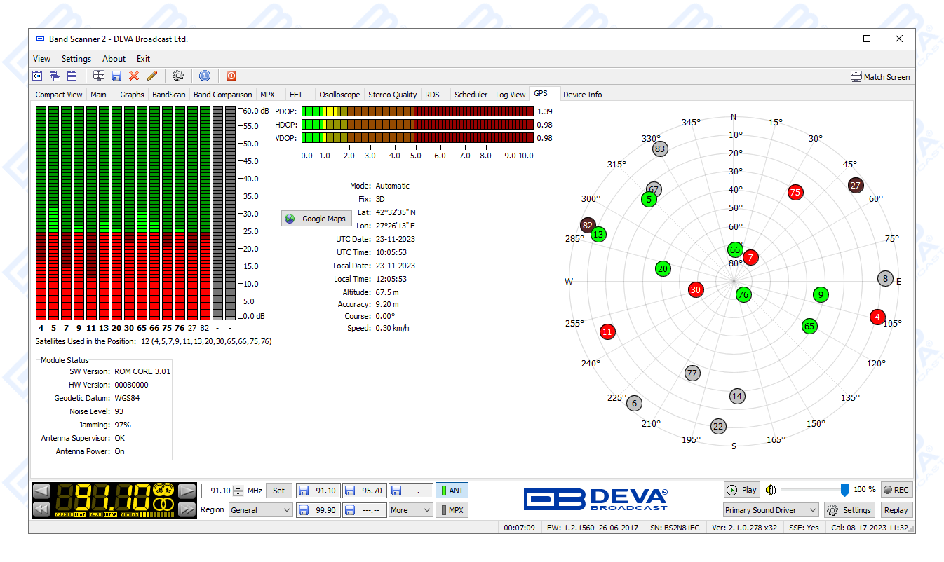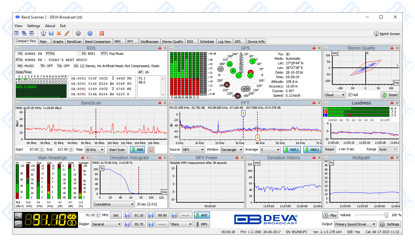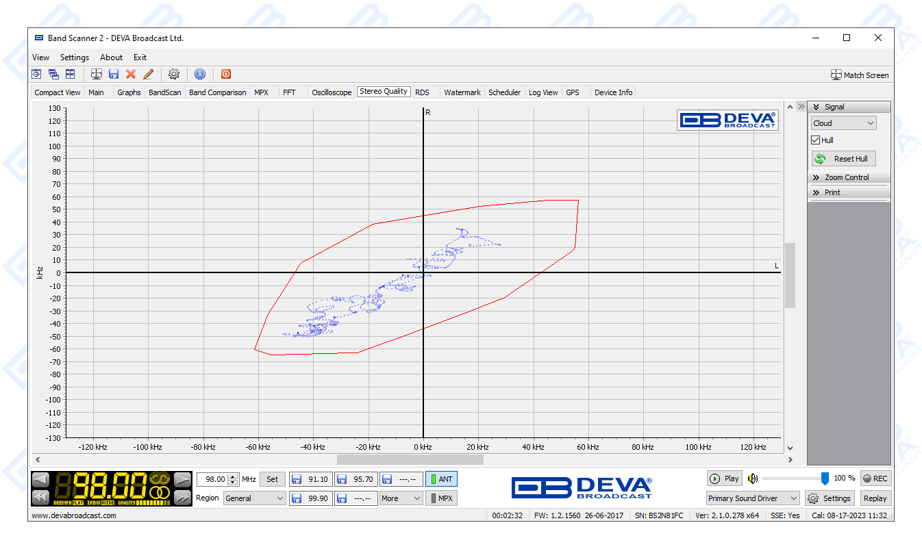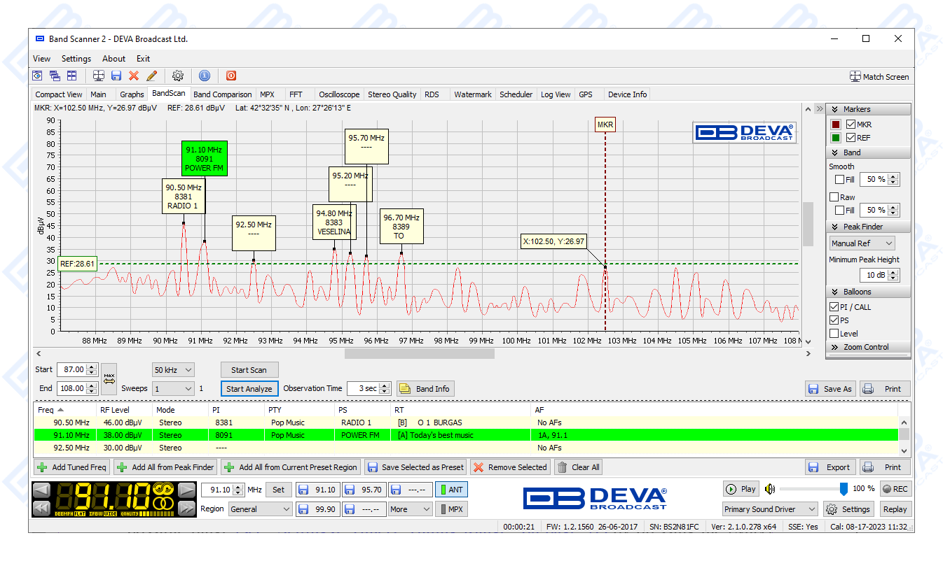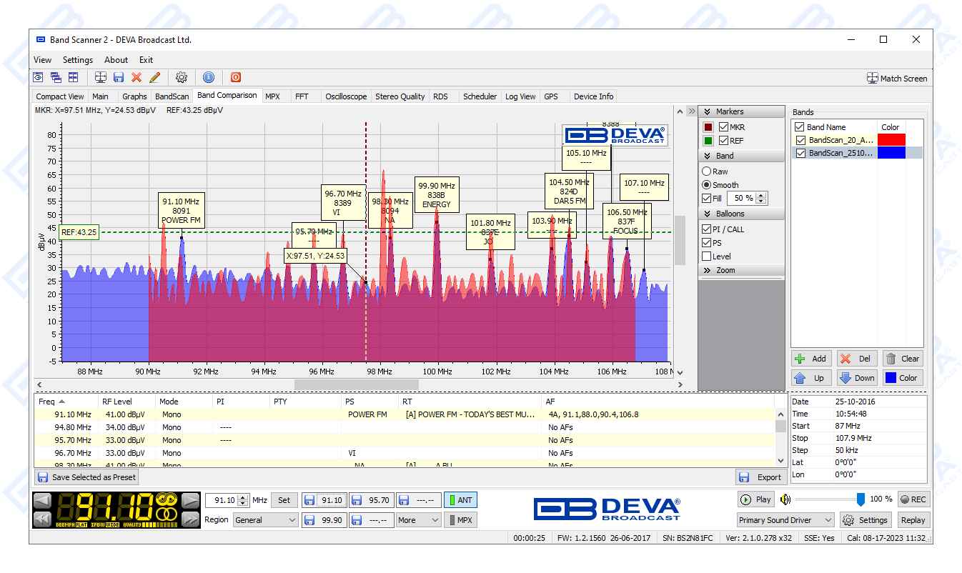 The free-of-charge Windows software sweeps the receiver across the FM band and generates a spectrum display of carrier level versus frequency. Each carrier is analyzed and a station list is created. This sophisticated product further refines stations with an RDS presence to show all radio data groups transmitted. It allows for manual tuning through the receiver screen or by double-clicking a point on the spectrum plot or an entry on the station list. There are two ways to save spectrum plots - as jpeg or bmp files. A separate window on the receiver screen displays the RDS data error level. With the Band Scanner 2 you can also view playlists of the competitive stations, as well as save and export them into and Excel file.