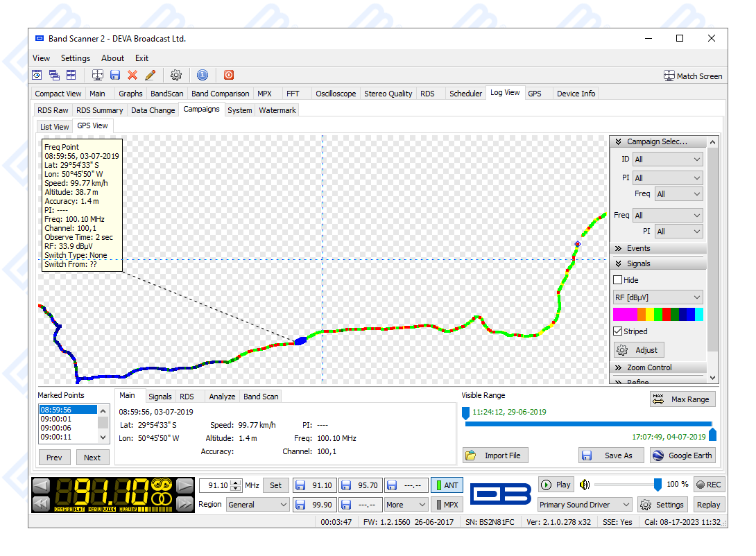| Data formats | Microsoft Excel compatible format (csv), Google Earth compatible KMZ, Proprietary Band Data format (bnd), Proprietary RDS Group Data format (grp), Proprietary Campaign Data format (cgn) |