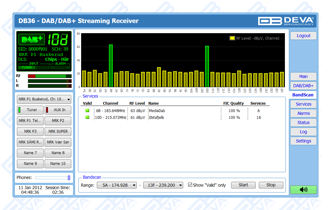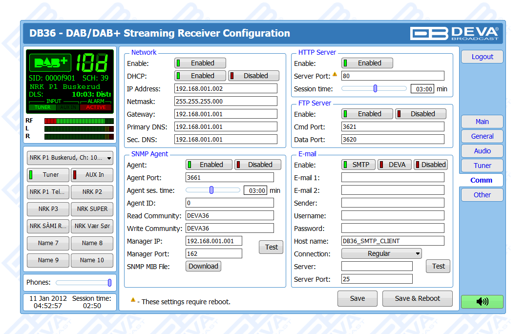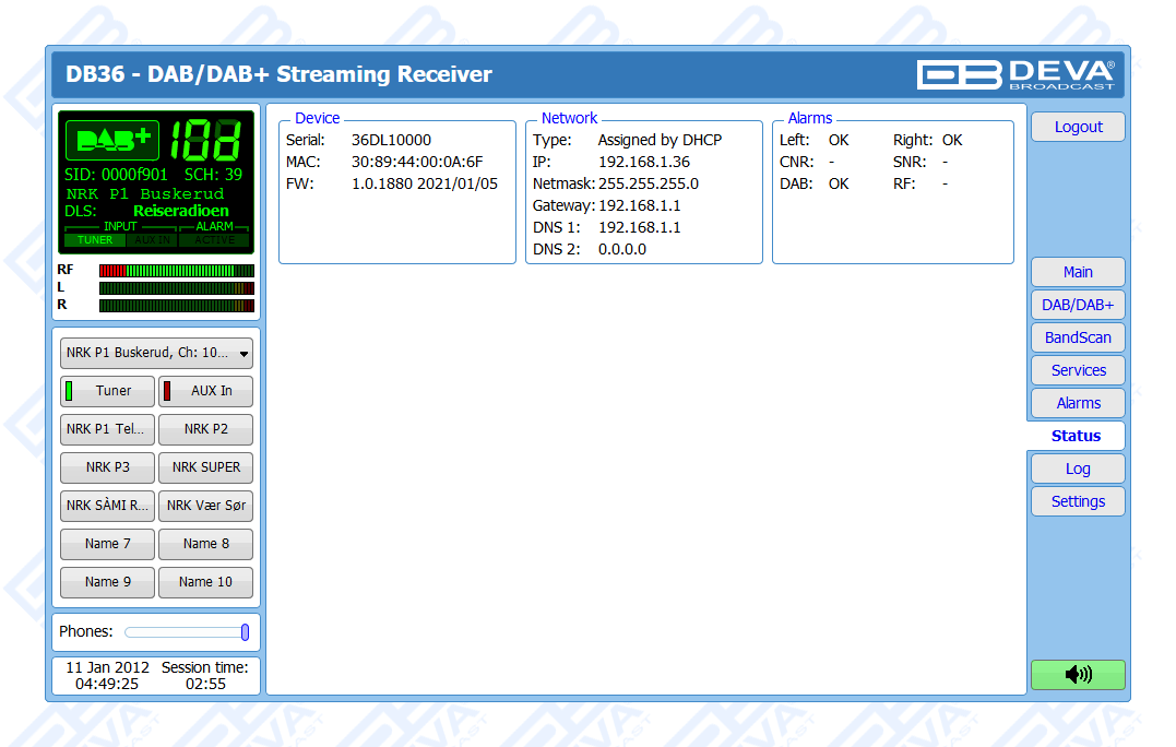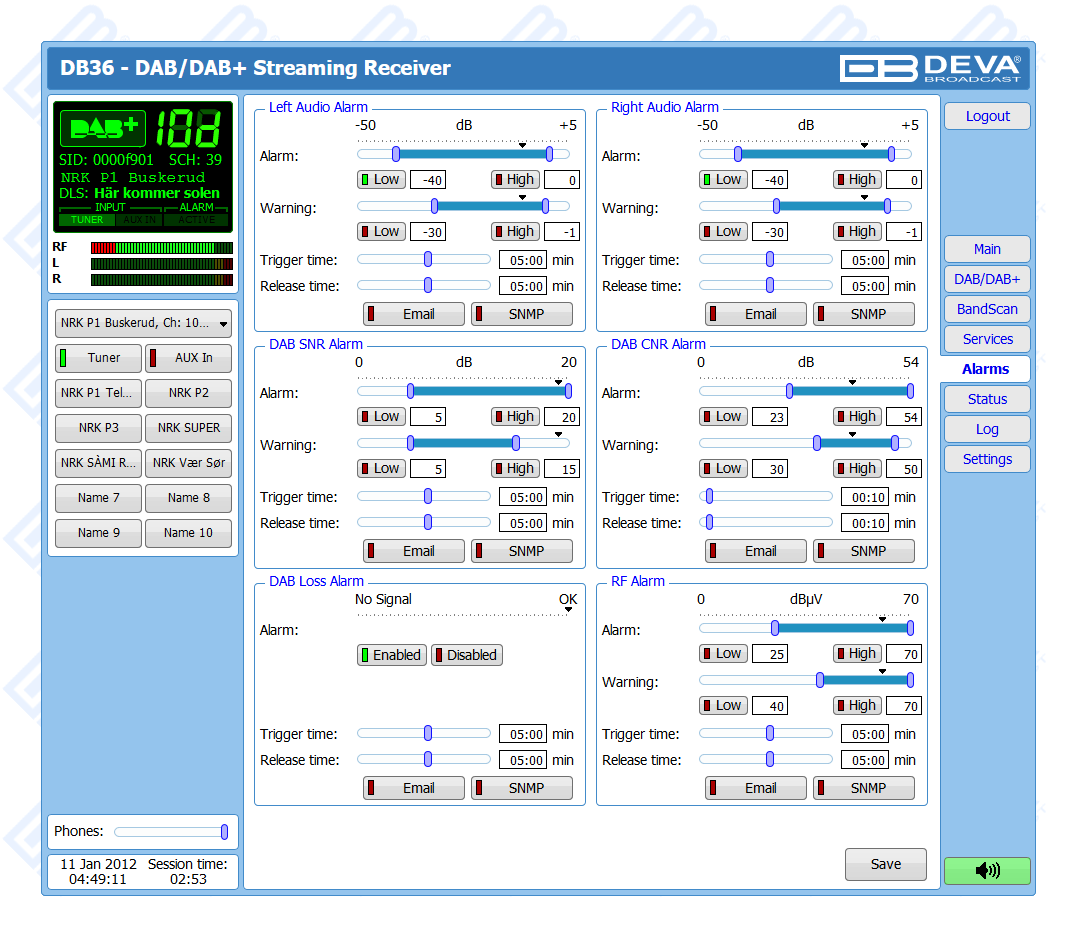 One of the main features of the DB36 is the fact that this tool guarantees no interruption of the broadcast signal. This is achieved through the provided local alarm options and online notifications via rear-panel alarm GPOs, E-mail and SNMP in case there is audio loss or change in the DAB signal and the Left and Right Audio Levels. This allows for a fast response on the part of the maintenance staff so that prolonged signal loss can be prevented.