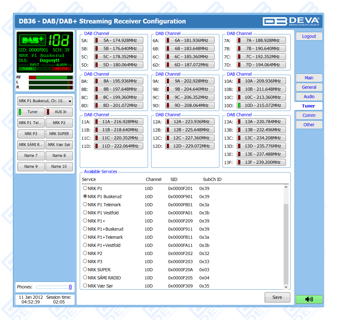 - Predefined DAB channels scan or manual tune