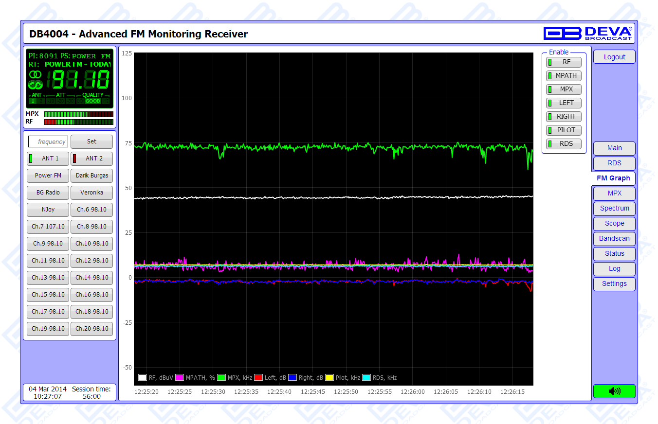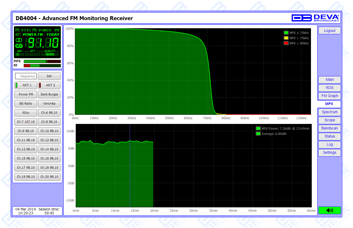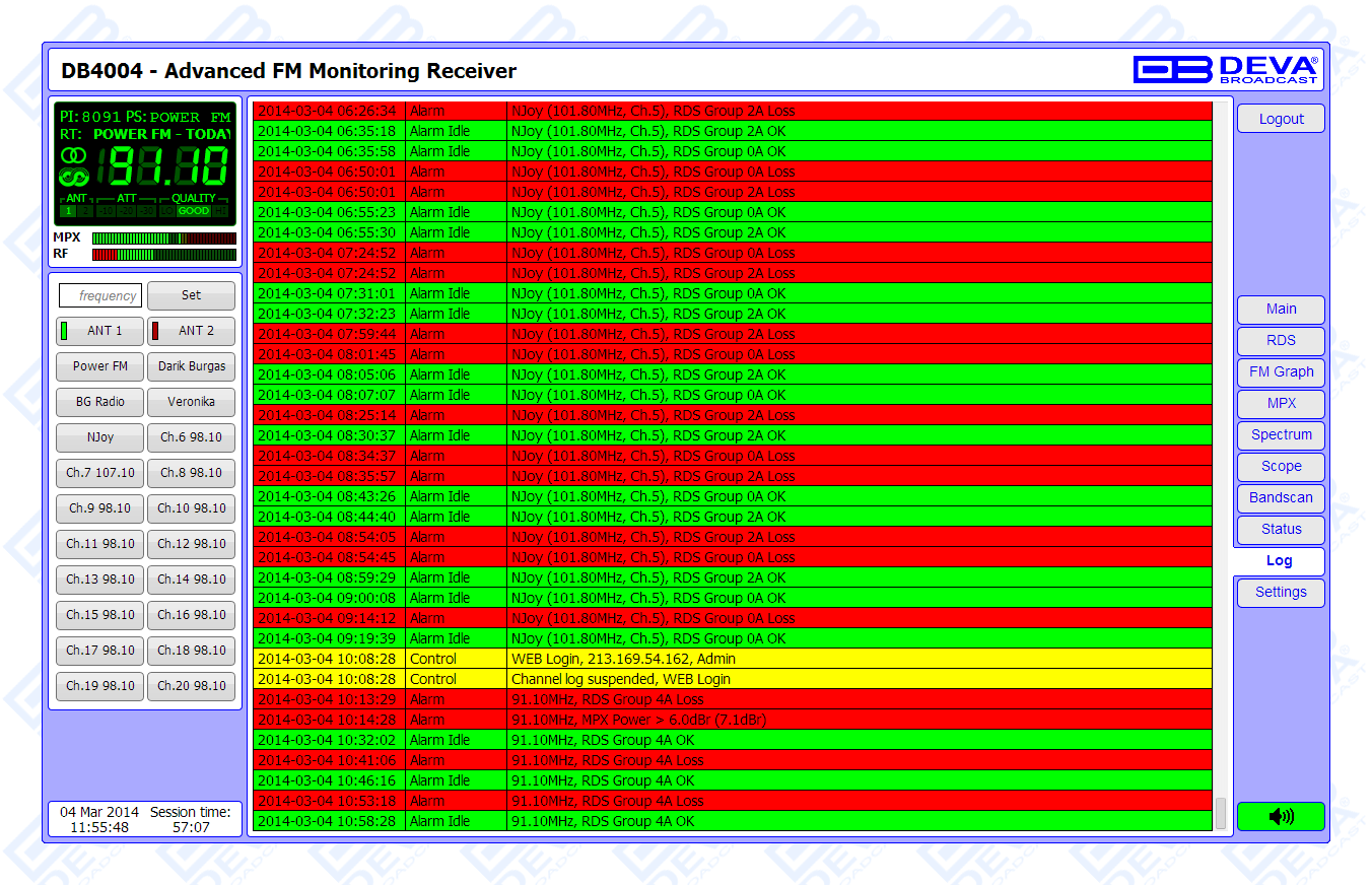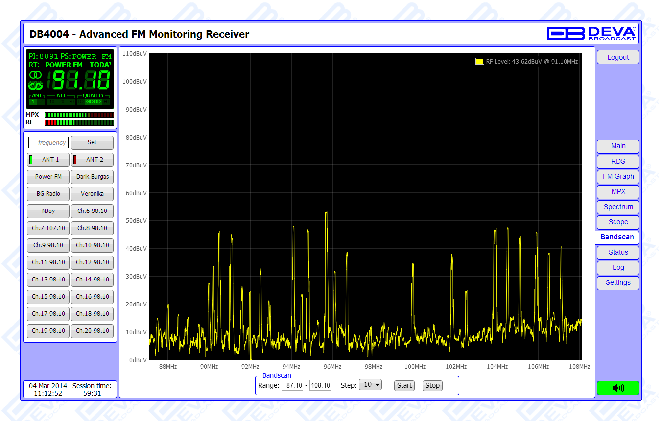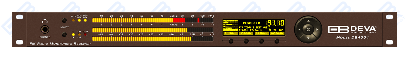 All the channel measurements and logs are saved on internal device memory. The built-in FTP system manages the files by an assigned schedule. All the collected information is centralized in a database and can be revised, played back, and sent automatically to the qualified staff if need be. The Interactive Software-based Log Viewer tool allows very detailed control and analysis of any station from the list of the monitored channels. The Band Analyzer function of the DB4004 presents an overview of all FM signals available, plus the RF signal strength of these stations. Scans are possible within any section of the band in the FM band in 3 different modes. The generated spectrum diagram shows the RF Level vs. the Frequency. Scheduled Band Scans can also be enabled for RF intruder or pirate transmissions detection. The DEVA Broadcast’s DB4004 is a superb monitoring system designed as a powerful tool for FM Radio signal analysis and regular off-air monitoring of your stations.