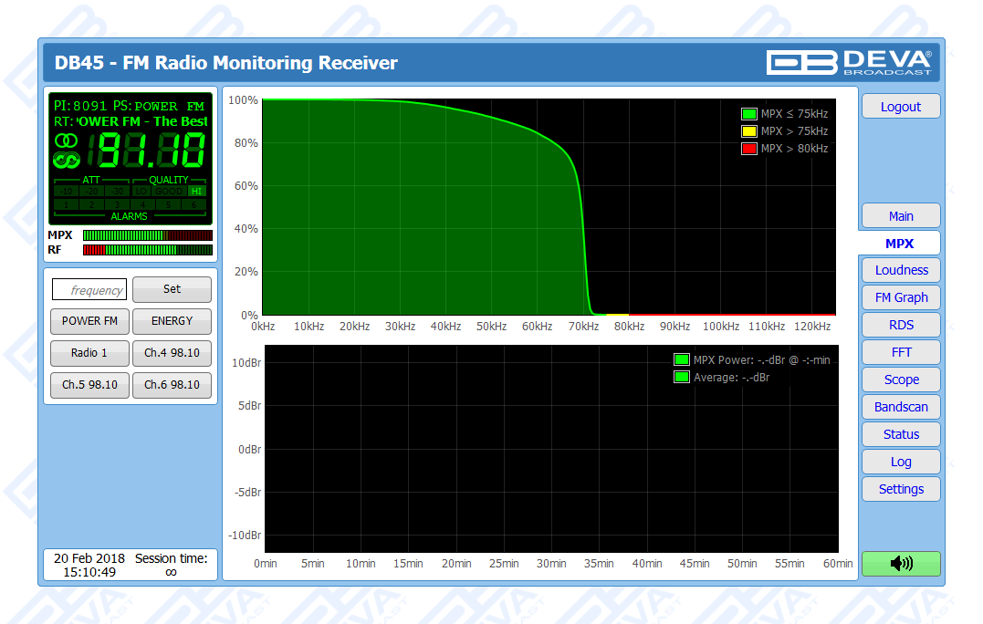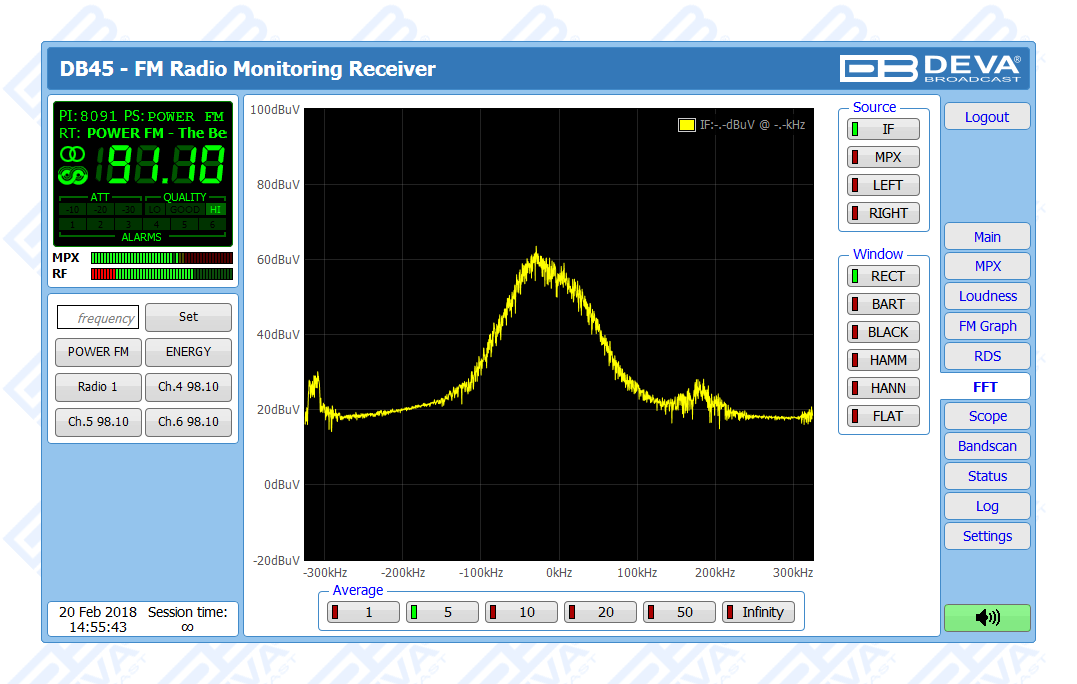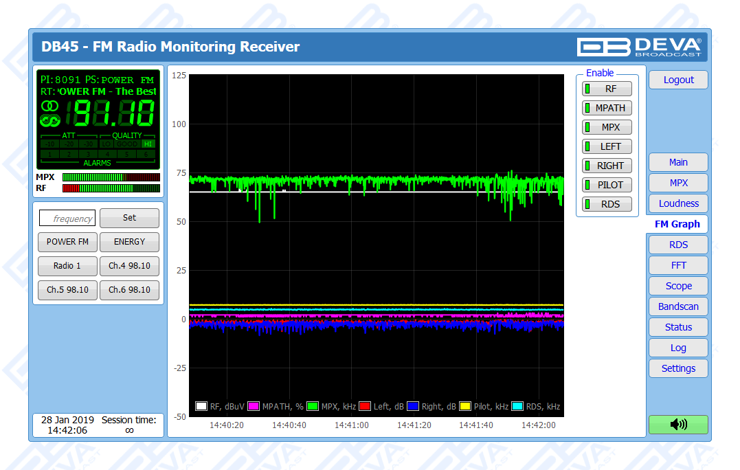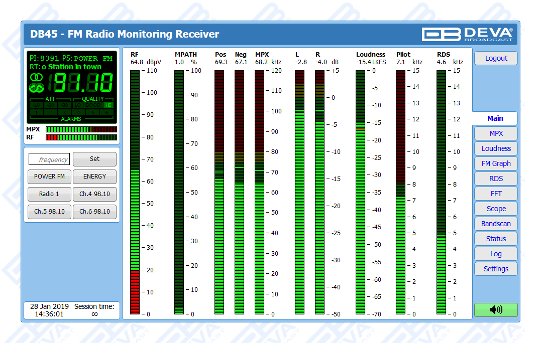 Maintaining the high standards of the DEVA product range, the DB45 model is the very definition of reliable monitoring of the FM signal. With a compact and practical design, it incorporates a variety of features spelling accurate and dependable measuring of the signal parameters, including the RF level, MPX deviation, MPX power, Left & Right audio levels, RDS, and Pilot injection levels.