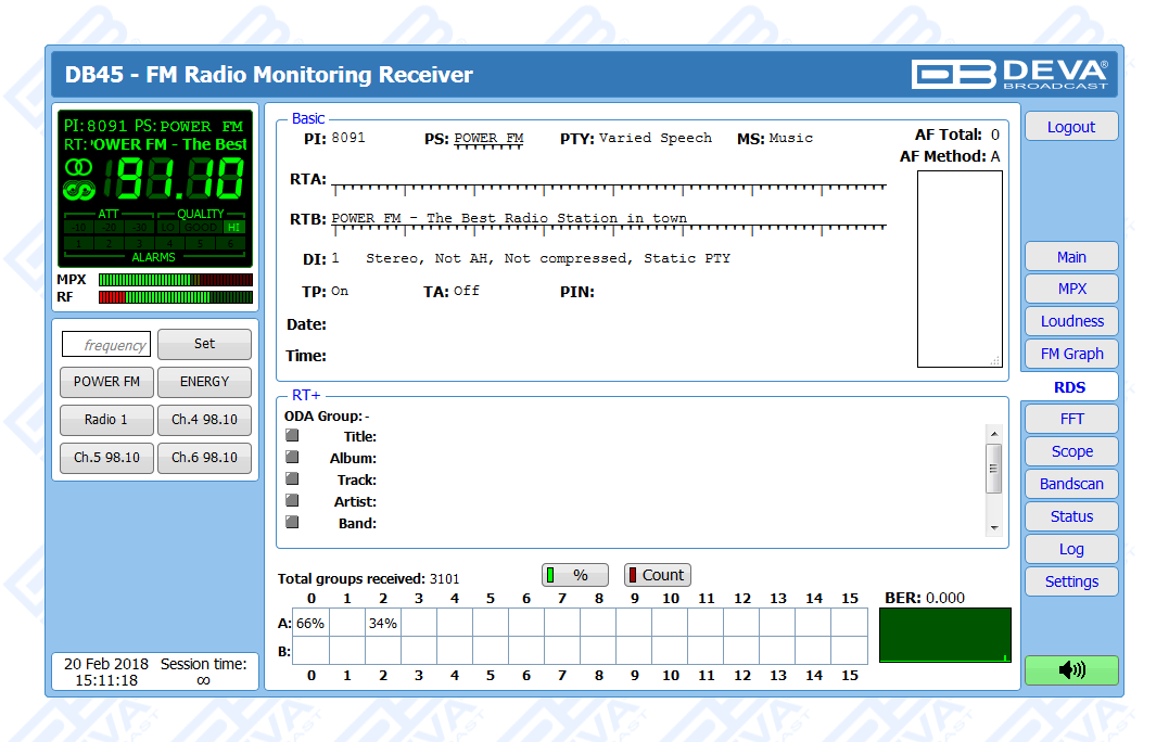 The DB45 model provides an RDS/RBDS decoder with BER meter, as well as adjustable alarms for RF, deviation, Pilot and RDS signal via email, SMS and SNMP, while the WEB interface makes for easy set-up and control of your unit.