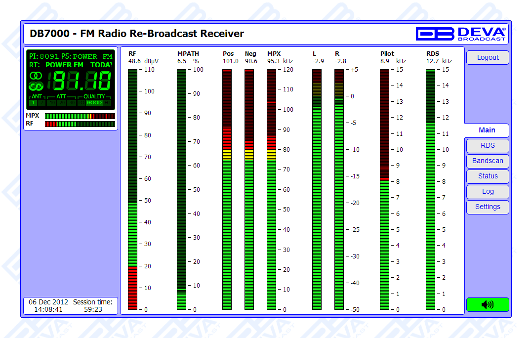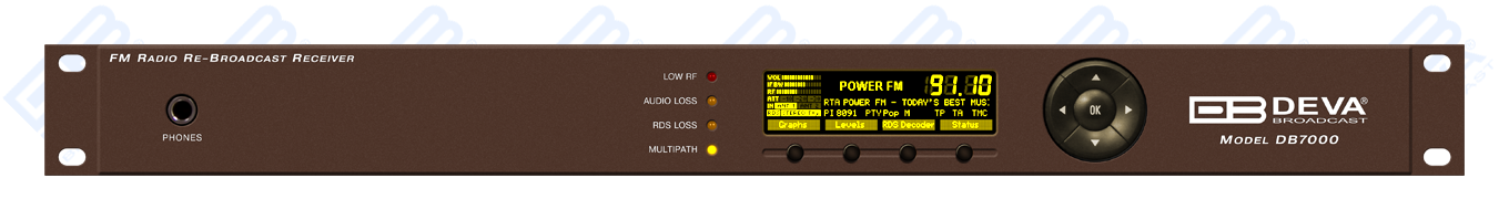 DB7000 is a frequency-agile, digitally-tuned FM Re-Broadcast Receiver equipped with a sophisticated and high-selective DSP based FM-tuner. The RF (IF) signal is digitalized as soon as it enters the device and all signal processing is then made through DSP algorithms. The signal being digitalized in this way, at the input, the equipment acquires measurement reproducibility over time. The high-accuracy DSP based IF bandwidth filters help to solve difficult adjacent-signal. The DB7000 measures conveniently all important parameters of FM transmissions. The built-in monitoring system will generate automatic warning messages in case of faulty or missing data. The incredible processing power of the device enables all measurements to be refreshed simultaneously and synchronously, thereby allowing for detailed readings of all the Multiplex FM signal components.