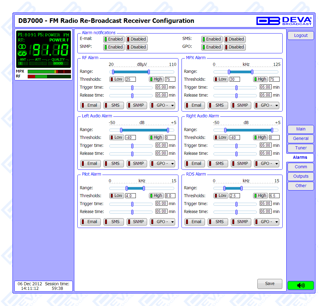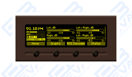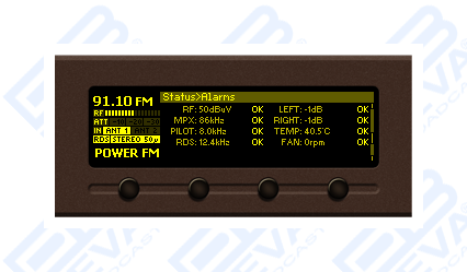 - Adjustable MIN/MAX alarms for RF, Pilot, L & R Audio Levels, MPX, RDS