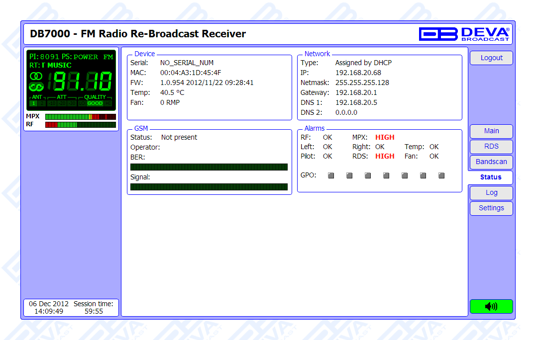 The Band Analyzer function of the DB7000 presents an overview of all FM signals available, plus the RF signal strength of these stations. Scans are possible within any section of the band in the FM band in 3 different modes. The generated spectrum diagram shows the RF Level vs. the Frequency. Scheduled Band Scans can also be enabled for RF intruder or pirate transmissions detection. In case of a transmission failure, maintenance staff will be immediately alerted via E-mail, SNMP, or SMS which signals the technicians to restore a normal service as soon as possible. A high performance level and sustained reliability make the DB7000 to satisfy the requirements of the most demanding broadcasters, as well as the satellite and cable operators. This product has been designed with the latest state-of-the-art audio technology in use, and with very low harmonic distortion!
