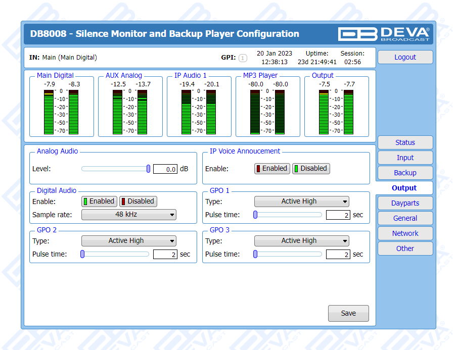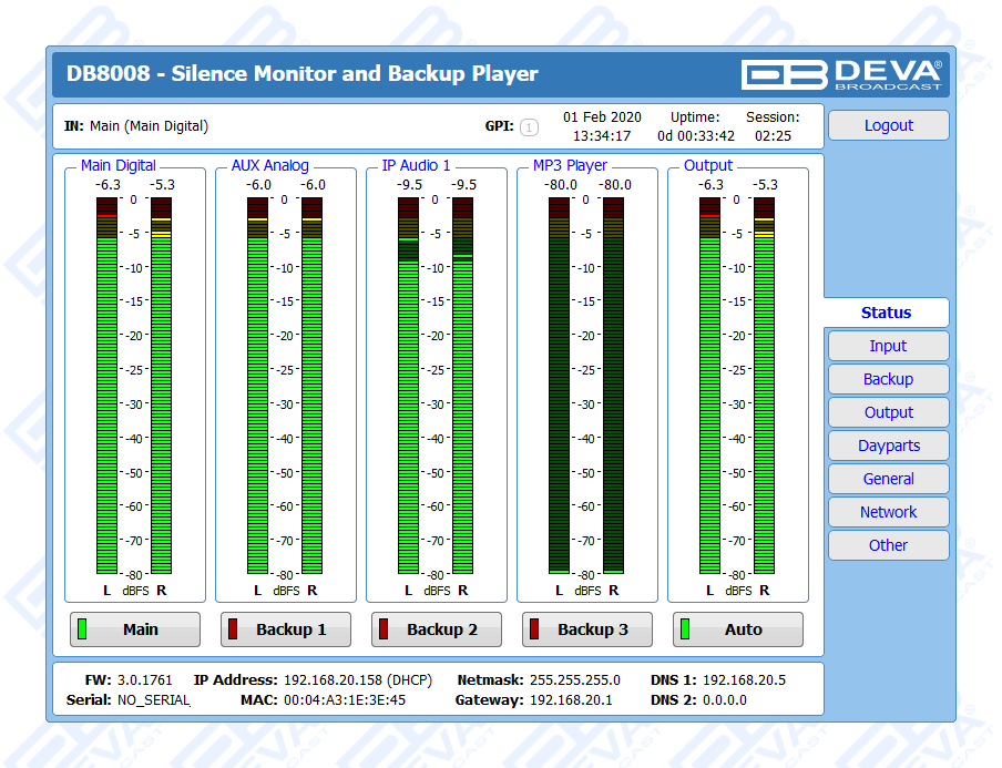 DB8008 has a built-in backup audio player. It plays tracks from SD Card storage uploaded over the FTP, in case of main audio signal loss.