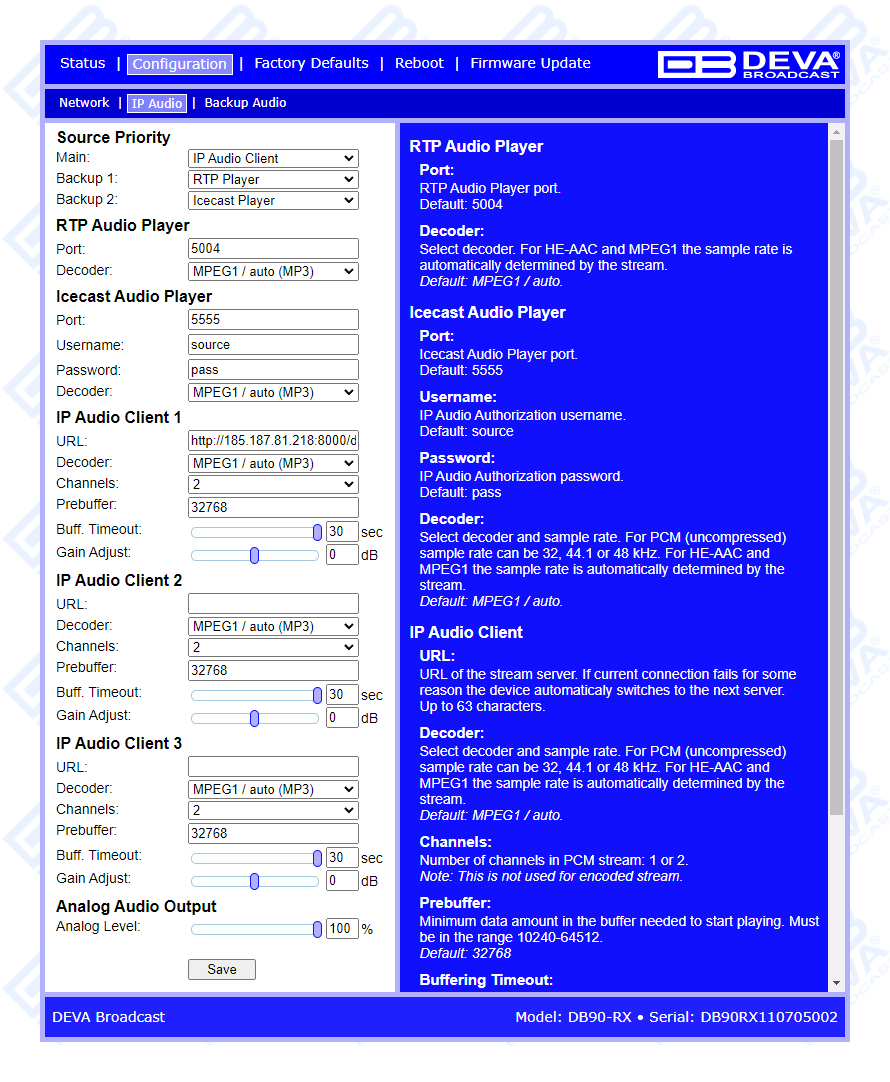 - The DB9000-RX/DB90-RX should have a static IP Address. If the device is placed behind a router, you will have to make sure that the Icecast Player server port is properly NAT forwarded;