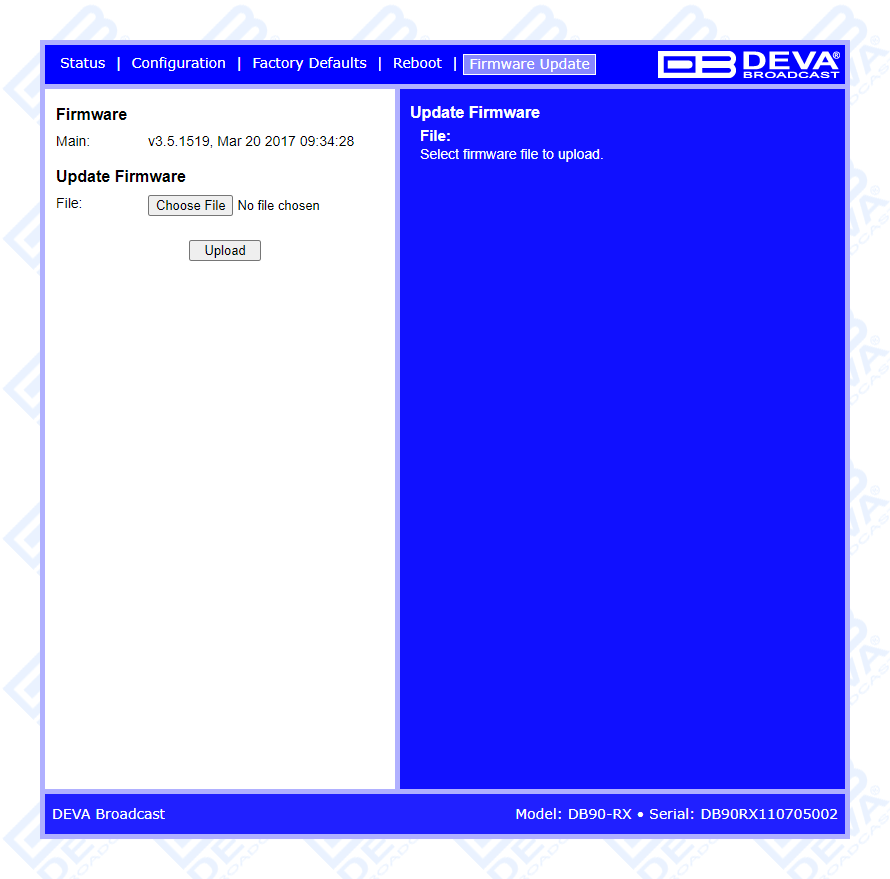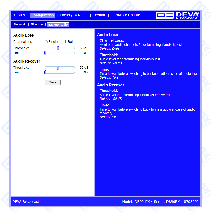 DB90-RX in combination with the HTML 5 based WEB Interface can be used for Broadcast, Internet Radio, Studio to Transmitter Link as well as VoIP applications. It is compatible with every online radio system, including Icecast and Shoutcast, and also supports low latency Real Time Protocol (RTP) connection.