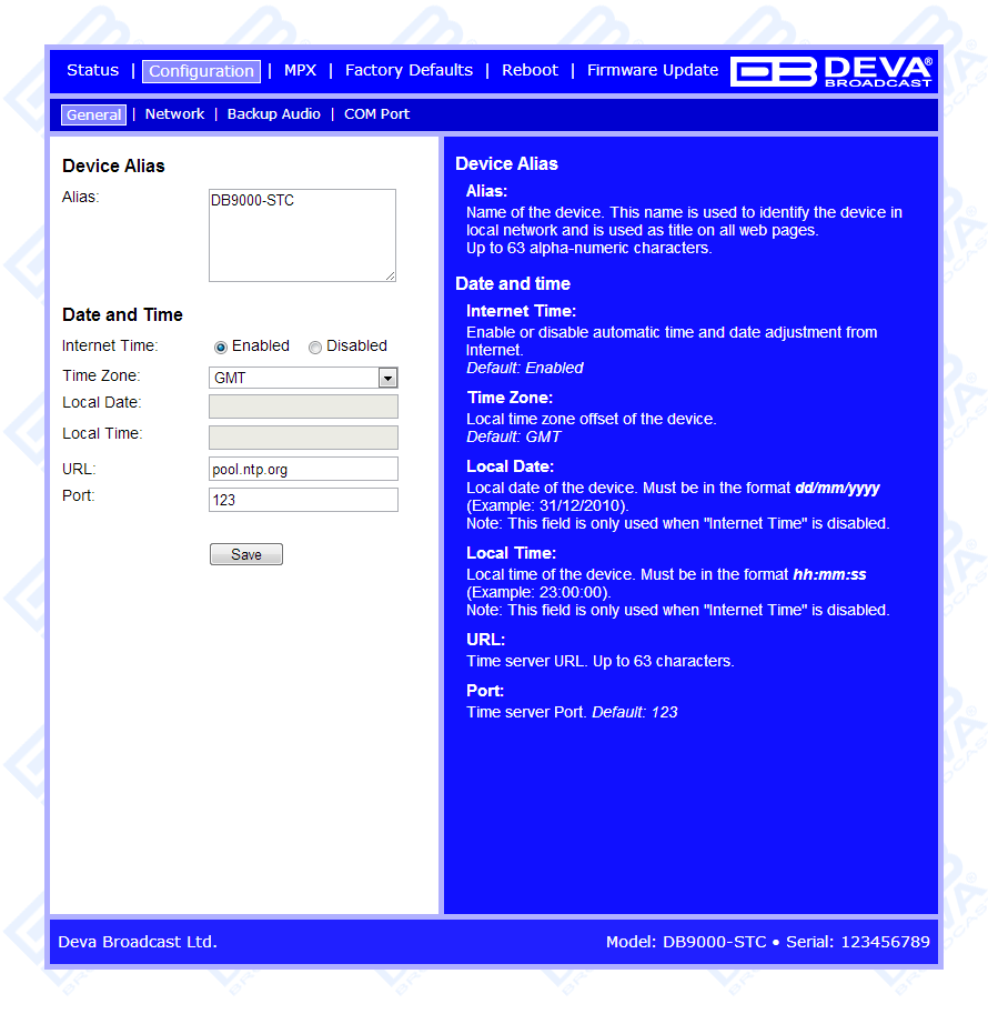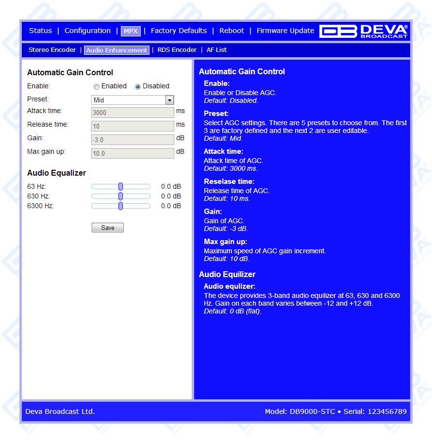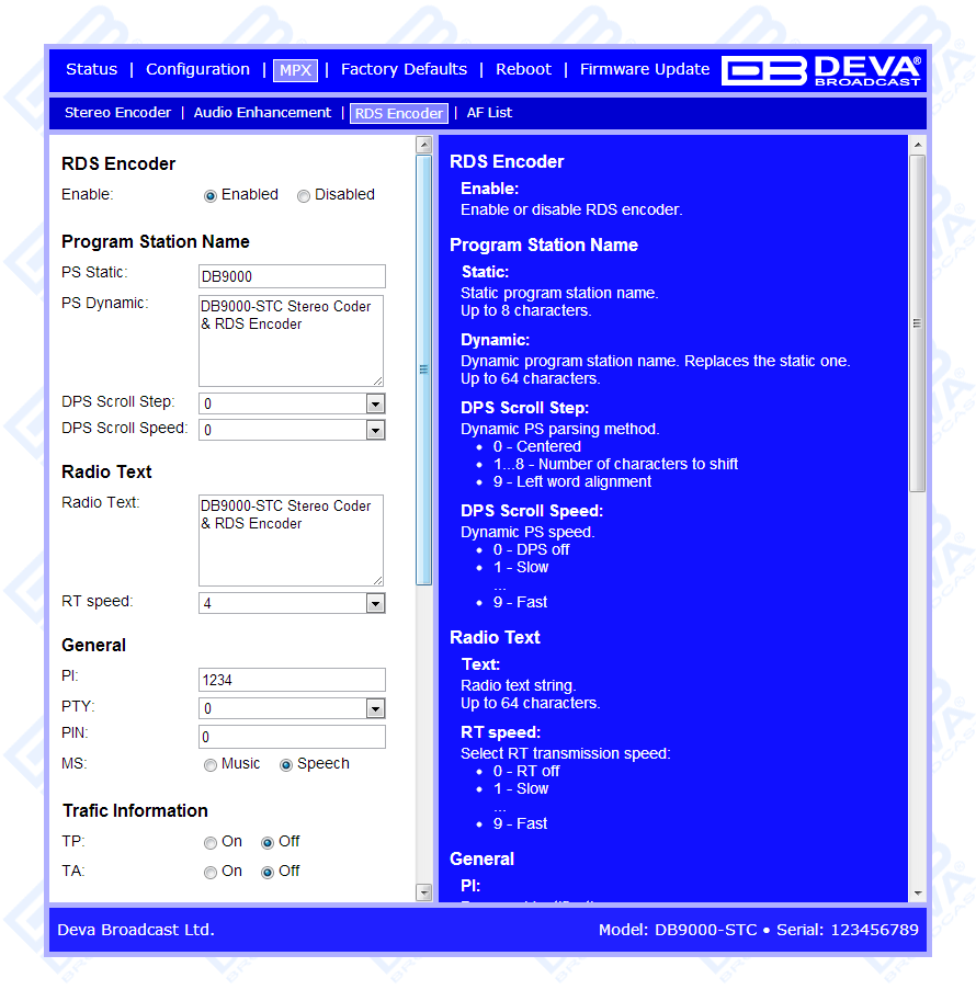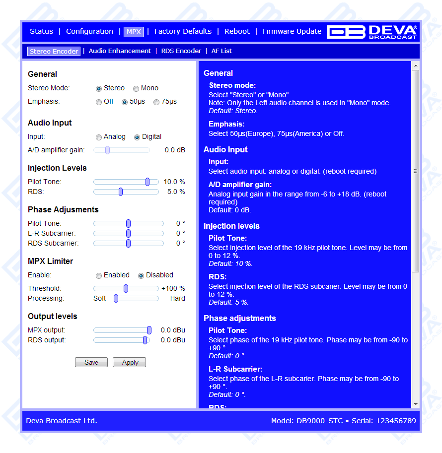 DB9000-STC is a high-performance, 32bits DSP based Stereo Generator with built-in RDS/RBDS encoder. It has been successfully designed to satisfy the most demanding requirements of FM Stereo generation and advanced RDS/RBDS encoding. This Stereo Encoder accepts both, Analog and Digital AES/EBU audio sources. DB9000-STC comes with an easy to use and password protected Web Server and a comprehensive remote control features. It supports SNMP, RS232, UDP, TCP/IP communication protocols. Its digital architecture guarantees long term reliability and easy firmware updates, directly on field or from remote.