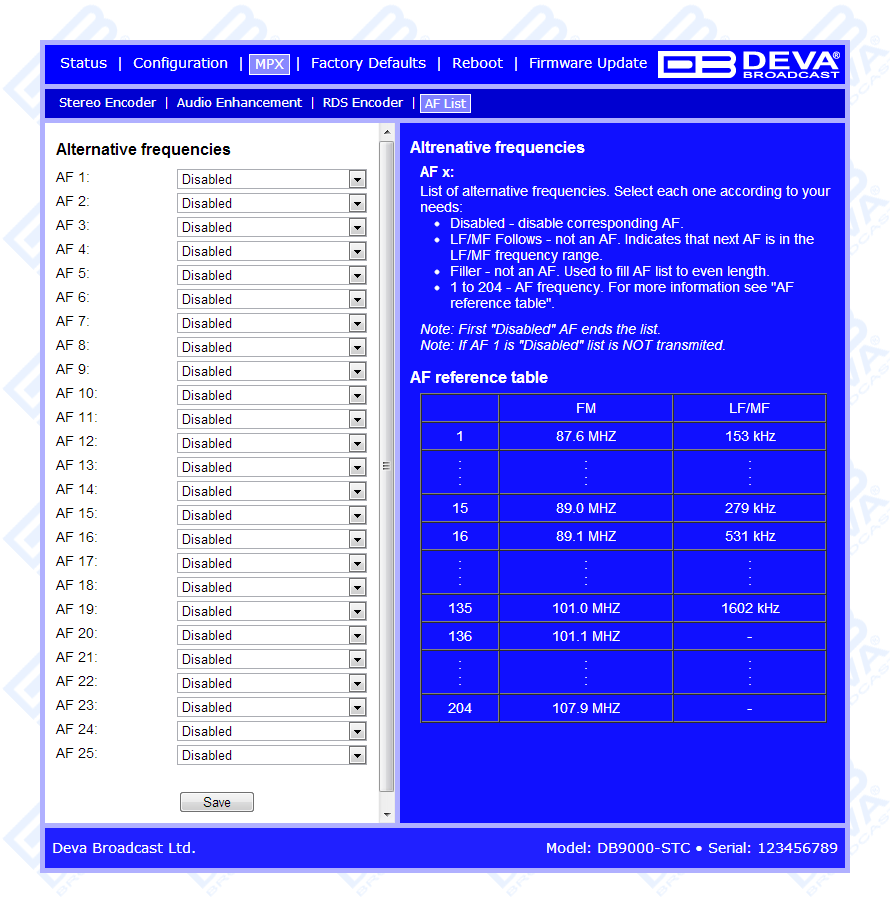 DB9000-STC is controlled trough a build in WEB Server and a standard web browser can be used to monitor its status or to make some adjustments. Once you have accessed the WEB Interface, in order for the needed AF adjustments to be made, go to MPX section, then select AF List subsection and set a number of alternative frequencies. Then, if for example you have specified 3 AFs, the 4th AF should be set as disabled. The disabled AF is considered as the end of the list and AFs after it will not be transmitted. Please note that If AF 1 is "Disabled" the list will NOT be transmitted.