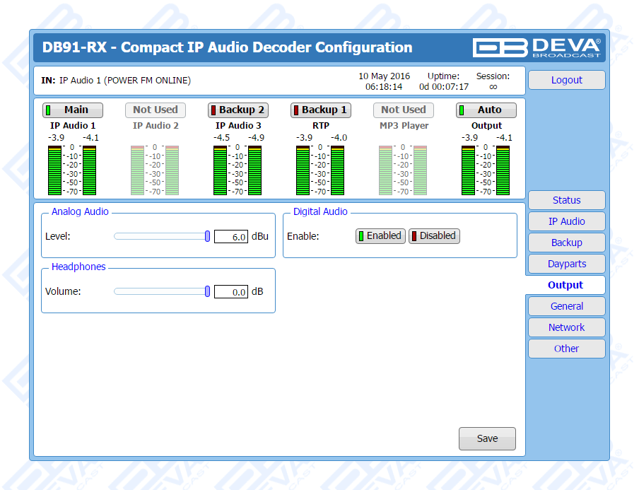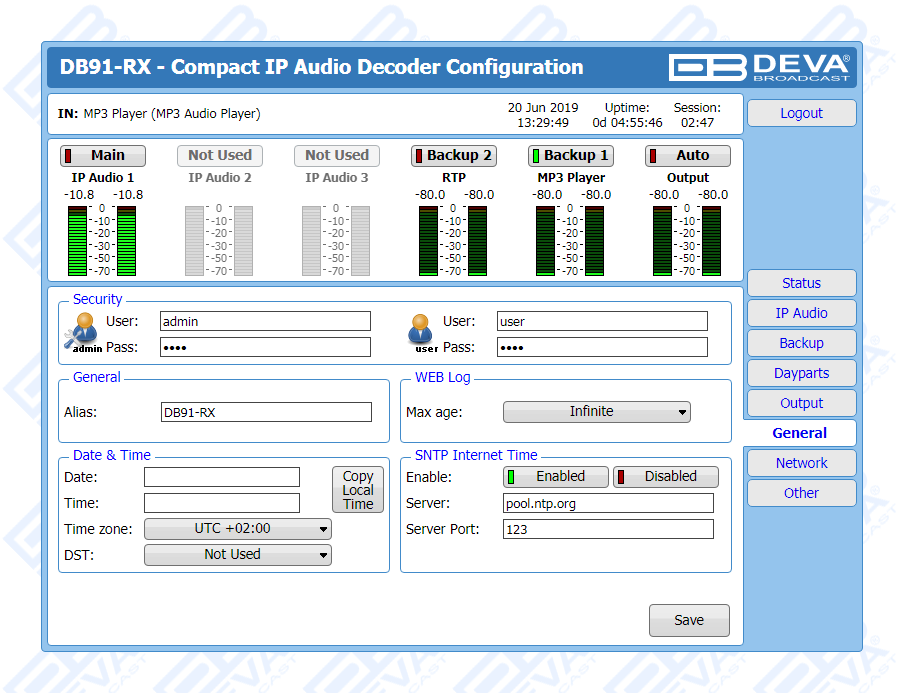 The DB91-RX is not only compatible with many online radio systems, Icecast and SHOUTcast included, but also supports low latency Real Time Protocol (RTP) connection. Controlled through a simple and intuitive HTML 5 based WEB Interface, the device can be used for Broadcast, Internet Radio, Studio to Transmitter Link, as well as VoIP applications. The DB91-RX IP audio decoder could be also set to work as a multicast RTP receiver, which makes it a particularly valuable asset when delivering audio to multicast groups.