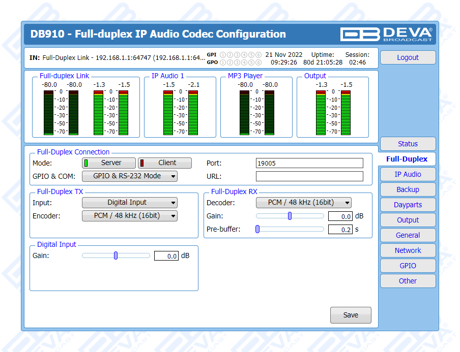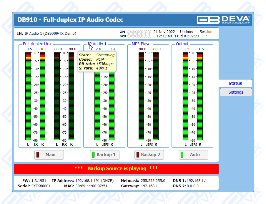 A full duplex solution when two tools are in use, the DB910 allows you to send and receive audio at the same time, while guaranteeing fast and easy monitoring of the signal fed to the transmitter. Where two-way transmission is not required, DB910 may be used as a decoder, being fully compatible with DEVA’s already widely-known hallmark IP audio codecs.