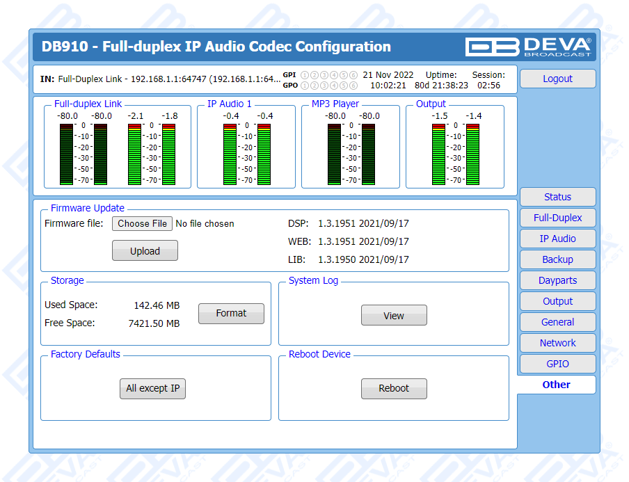 Apart from its main audio source, DB910 supports several IP audio sources and a built-in MP3 Backup Audio Player in addition. With several backup audio sources incorporated, the DB910 will immediately switch between the sources when the audio is lost, and return to the main one when the audio is restored, with no user intervention. The audio content for the MP3 player is recorded on the internal SD card. The backup files can be managed remotely through the built-in FTP Server, via standard FTP client.