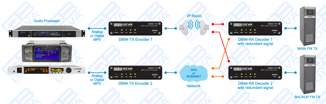 As part of DEVA’s growing portfolio of IP audio solutions, the DB94 is engineered with precision and built using top-tier components, including high-grade ADCs for maximum signal fidelity. It supports both Analog MPX and Digital AES192 inputs, ensuring broad compatibility across different transmitter systems and network architectures. Whether deployed for a single transmitter site or integrated into a larger network, the DB94 delivers consistent, high-quality audio over IP.