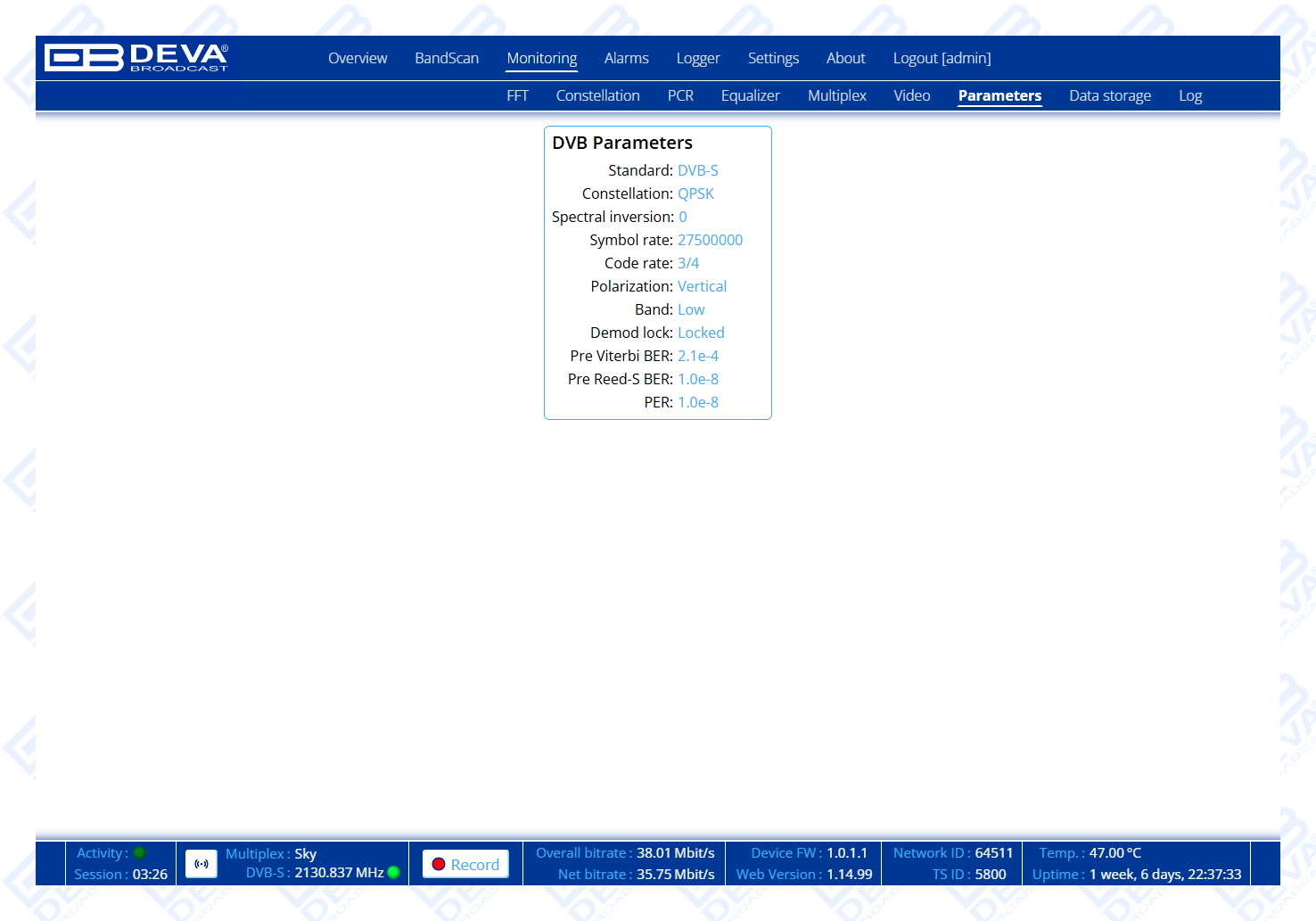 | BER (DVB-S2) | Pre-LDPC, Post-LDPC, PER; Eb/N0, link margin, modulation parameters; MultiStream support, PLS support |