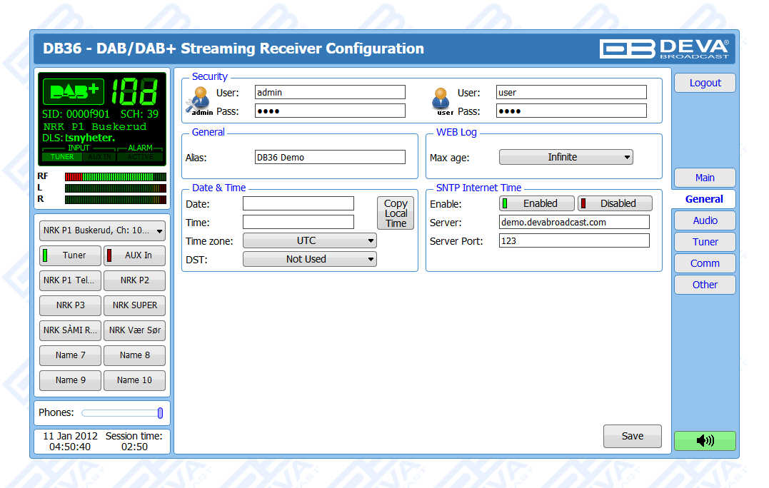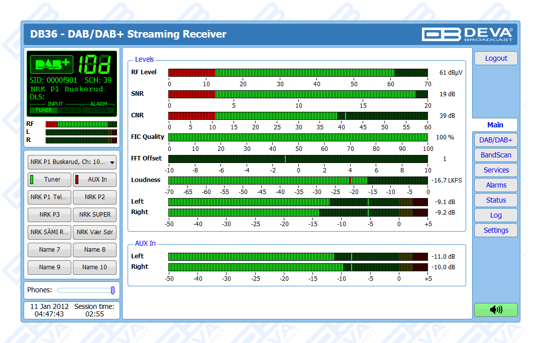 One of the main features of the DB36 is the fact that this tool guarantees no interruption of the broadcast signal. This is achieved through the provided local alarm options and online notifications via rear-panel alarm GPOs, E-mail and SNMP in case there is audio loss or change in the DAB signal and the Left and Right Audio Levels. This allows for a fast response on the part of the maintenance staff so that prolonged signal loss can be prevented.