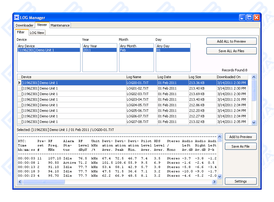 SNMP might be used to do(view) device settings and to see the parameters (measurements) of currently set tuner frequency. SNMP does not provide an opportunity to get any logged data in log files. FTP protocol should be used for this purpose.