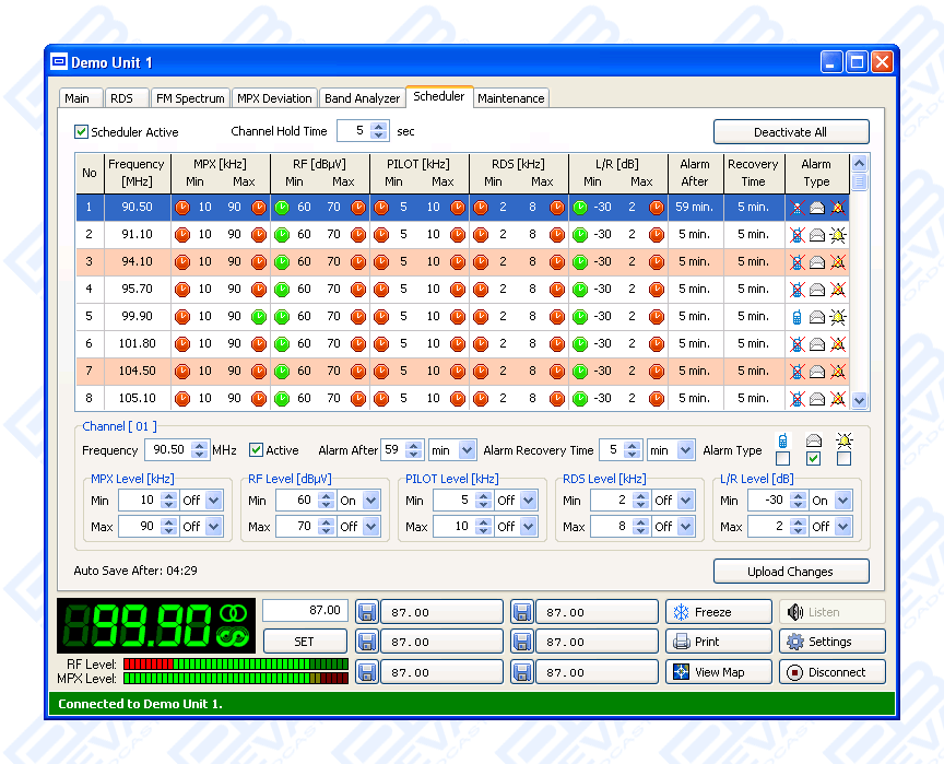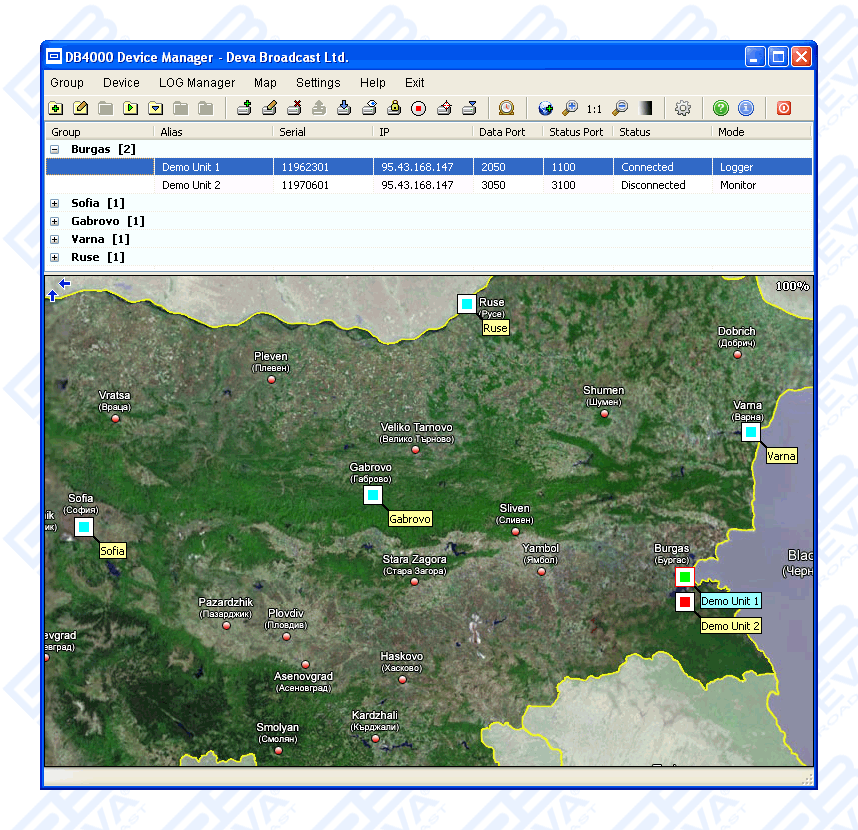DB4000 enables you to monitor your own frequency continuously and at the same time keeps you informed about your neighbouring stations. The included PC software 'DB4000 Device Manager' gives you control over unlimited number of field-installed units, and allows you to observe from the monitoring sites all the parameters and measurement values of your network. 'DB4000 Device Manager' is a total control solution for remote monitoring networks. The map interface enables getting immediate and clear view of the monitoring location or to the whole network. Due to the universal cartographic interface any kind of maps can be used. When using the map interface the user is allowed, by a flashing red light, to see quickly which site has an alarm on it. He can access the equipment and the alarm directly from this map with just a click on the desired location.