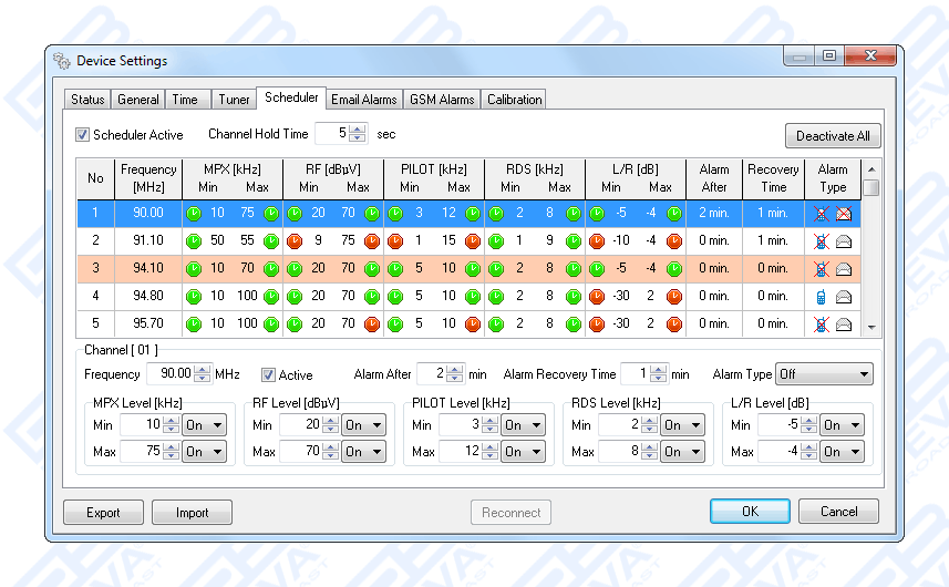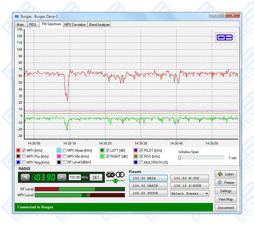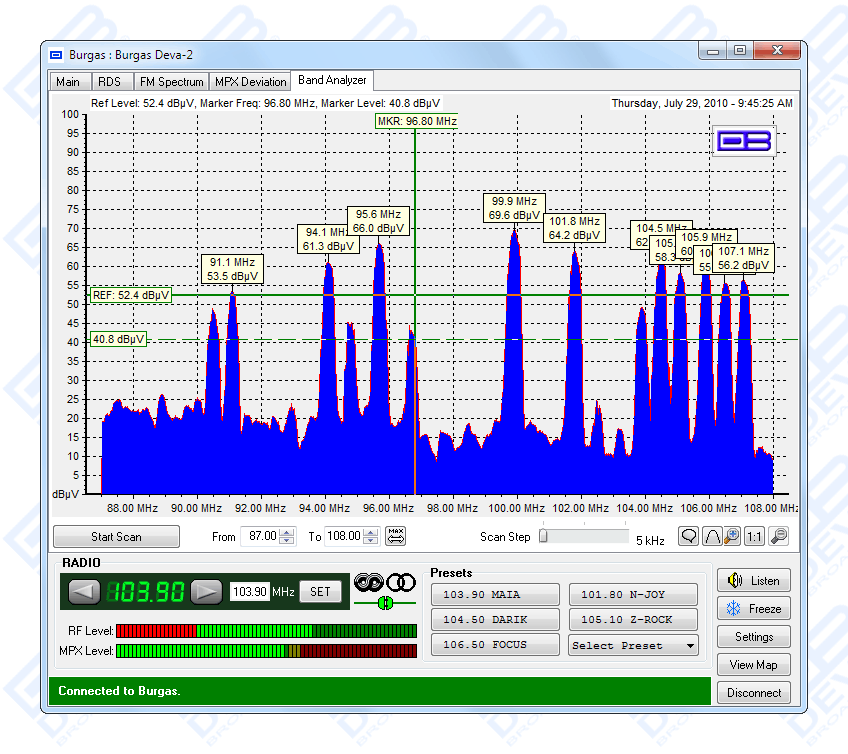 DB4000’s Server System is the best solution for the management of multi-site remote DB4000 devices. It is a server-based system that can manage alarms, measurements and data from the field units. The controlling software offers a very intuitive interface to create schedules for full control of a single or a number of monitored radio stations. The Band Analyzer function presents an overview of all the FM parameters together with the RF signal strength of the station. The Band Scanning is possible within FM band limits. The generated spectrum diagram shows the RF Level vs. the Frequency.