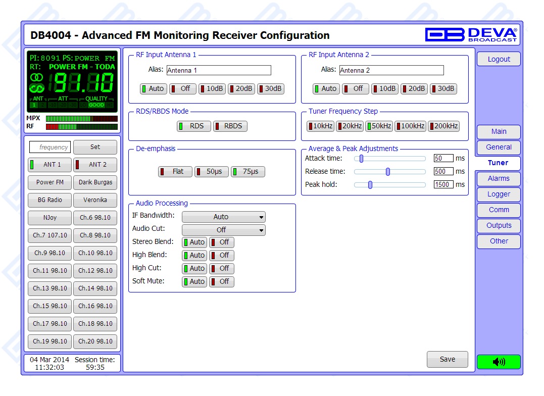All the channel measurements and logs are saved on internal device memory. The built-in FTP system manages the files by an assigned schedule. All the collected information is centralized in a database and can be revised, played back, and sent automatically to the qualified staff if need be. The Interactive Software-based Log Viewer tool allows very detailed control and analysis of any station from the list of the monitored channels. The Band Analyzer function of the DB4004 presents an overview of all FM signals available, plus the RF signal strength of these stations. Scans are possible within any section of the band in the FM band in 3 different modes. The generated spectrum diagram shows the RF Level vs. the Frequency. Scheduled Band Scans can also be enabled for RF intruder or pirate transmissions detection. The DEVA Broadcast’s DB4004 is a superb monitoring system designed as a powerful tool for FM Radio signal analysis and regular off-air monitoring of your stations.