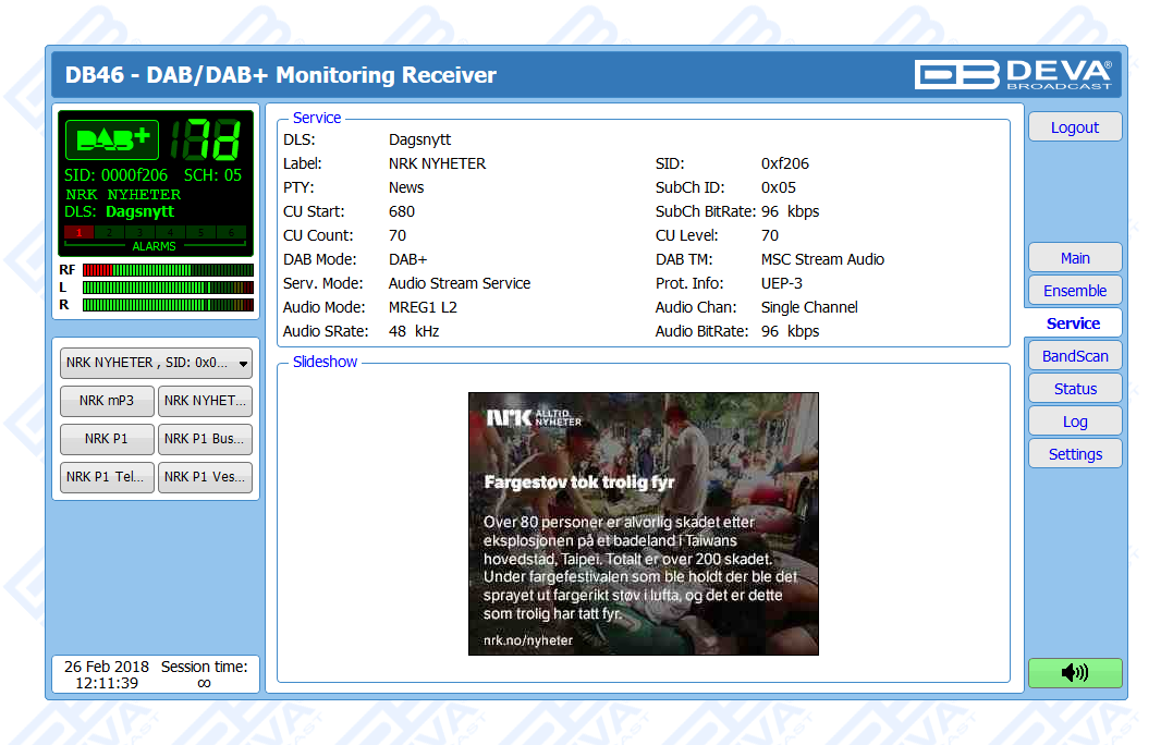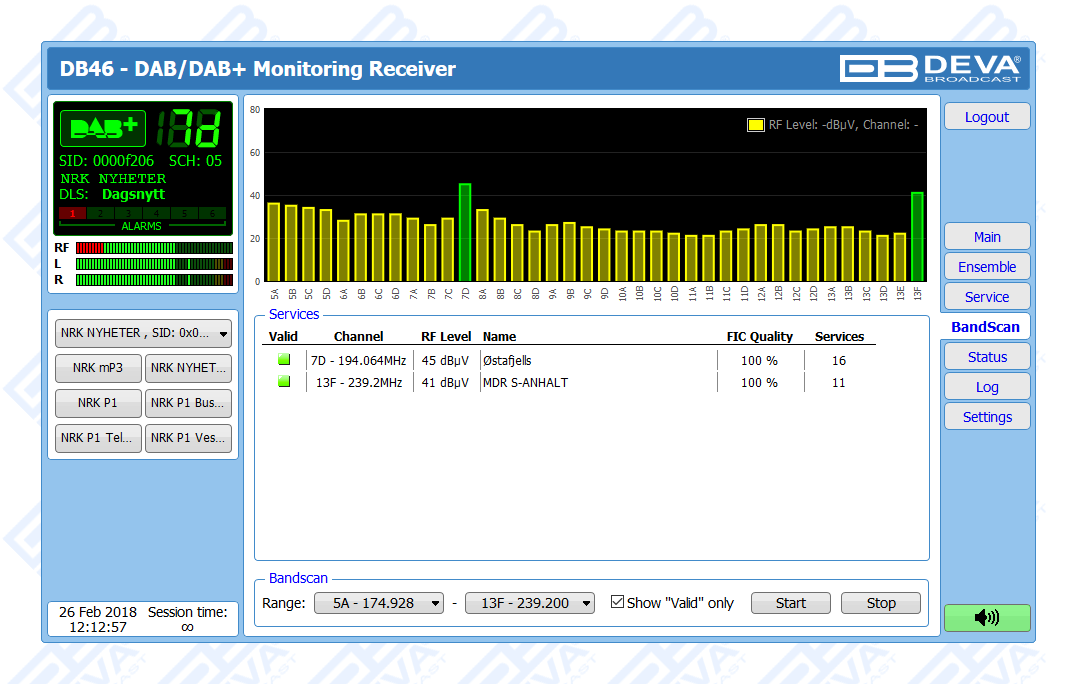 Continuing a tradition for products brought about by creative thinking and technological precision, the DB46 - Compact DAB/DAB+ Monitoring Receiver slots in seamlessly within DEVA’s range of monitoring tools by offering another dimension of accuracy and cost-effectiveness. While also retaining the defining characteristics of the DEVA brand, this revolutionary product is specifically dedicated to one of the major areas in the industry - Digital Audio Broadcasting, and fully meets the ETSI EN 300 401 DAB standard.