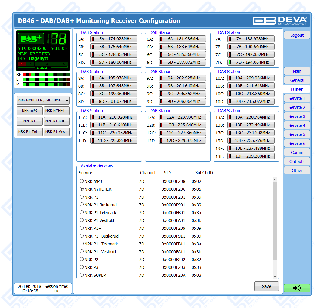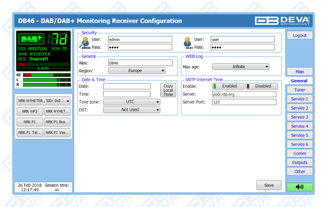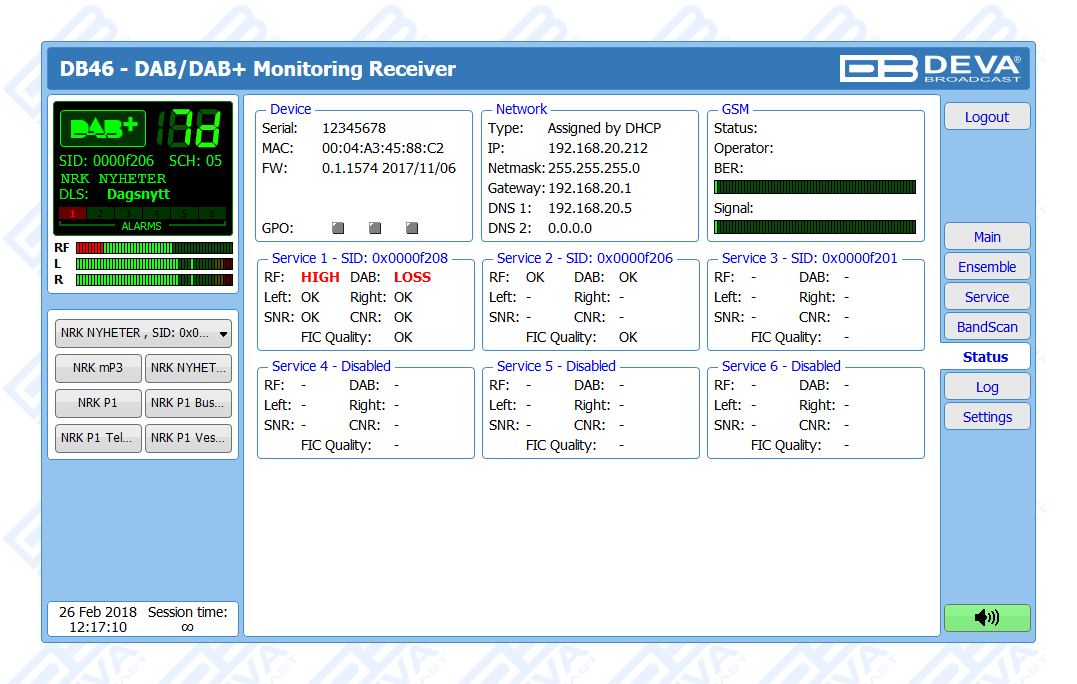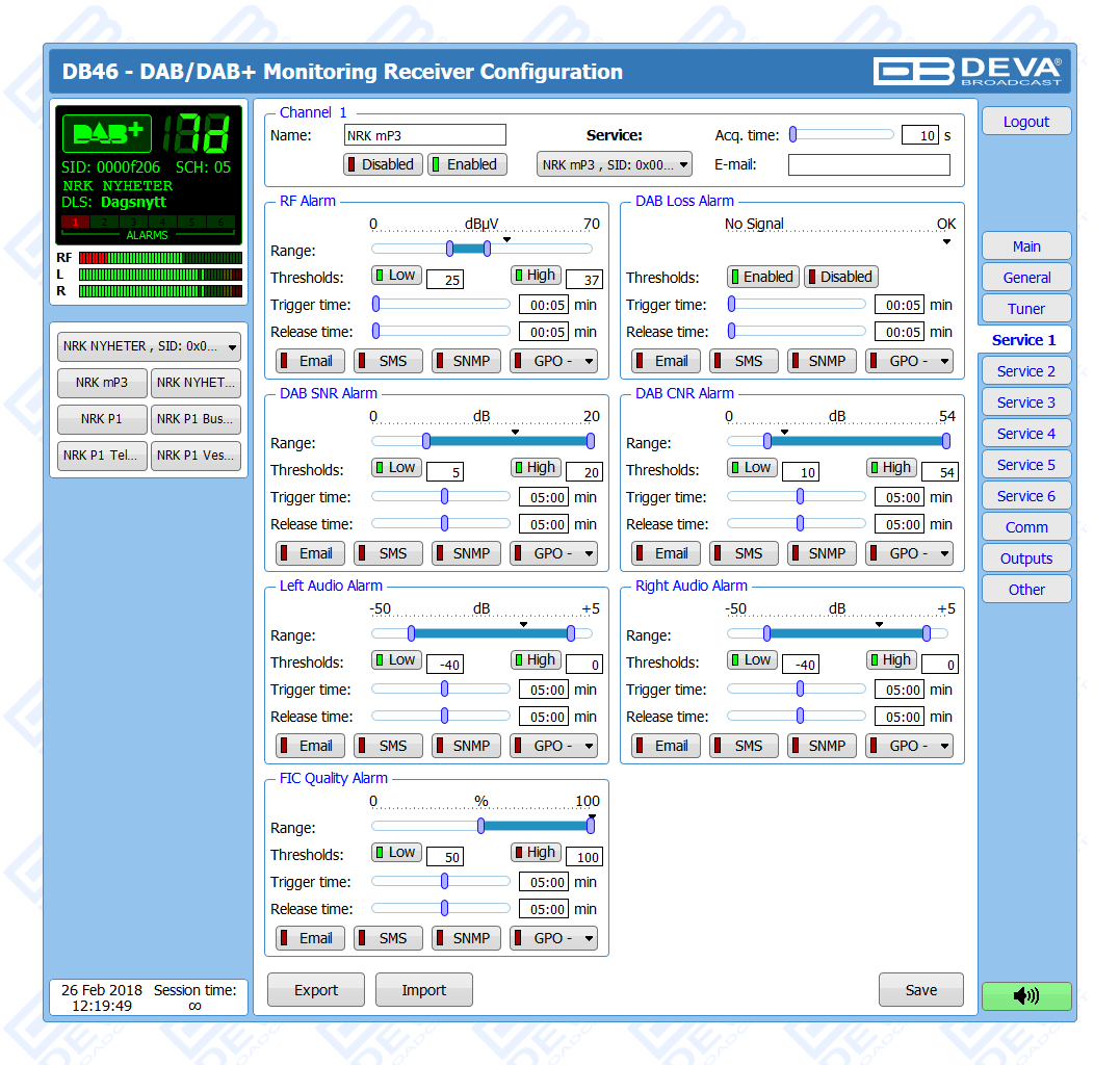 Another impressive feature of the DB46 is the fact that the tool guarantees no interruption of the broadcast signal. This is achieved through the provided local alarm options and online notifications via rear-panel alarm GPOs, E-mail and SNMP in case there is audio loss or change in the DAB signal and the Left and Right Audio Levels. This allows for a fast response on the part of the maintenance staff so that prolonged signal loss can be prevented.