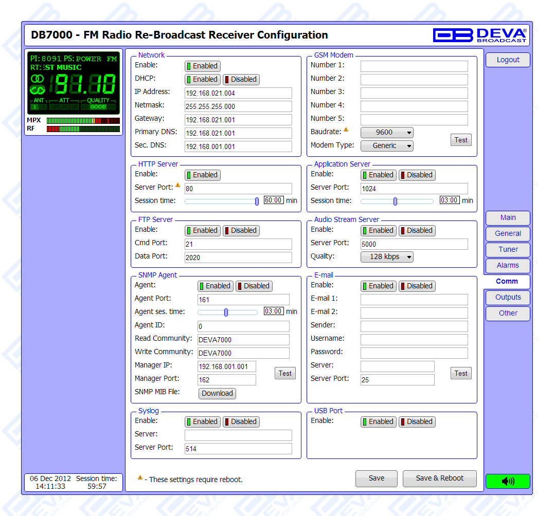 The Band Analyzer function of the DB7000 presents an overview of all FM signals available, plus the RF signal strength of these stations. Scans are possible within any section of the band in the FM band in 3 different modes. The generated spectrum diagram shows the RF Level vs. the Frequency. Scheduled Band Scans can also be enabled for RF intruder or pirate transmissions detection. In case of a transmission failure, maintenance staff will be immediately alerted via E-mail, SNMP, or SMS which signals the technicians to restore a normal service as soon as possible. A high performance level and sustained reliability make the DB7000 to satisfy the requirements of the most demanding broadcasters, as well as the satellite and cable operators. This product has been designed with the latest state-of-the-art audio technology in use, and with very low harmonic distortion!