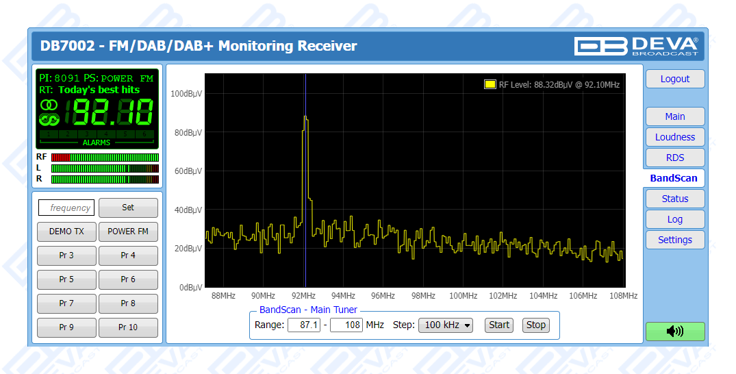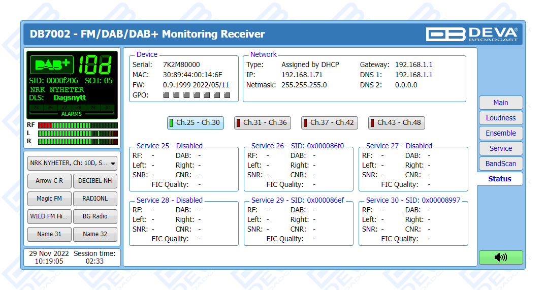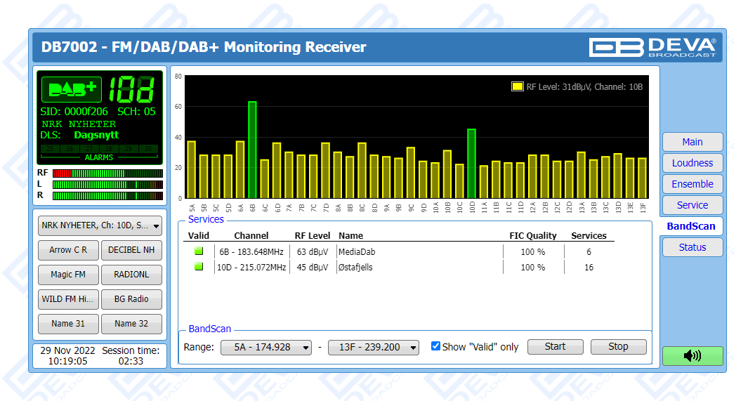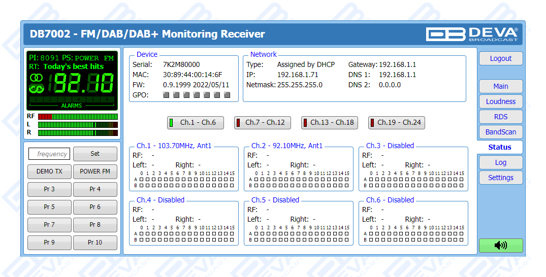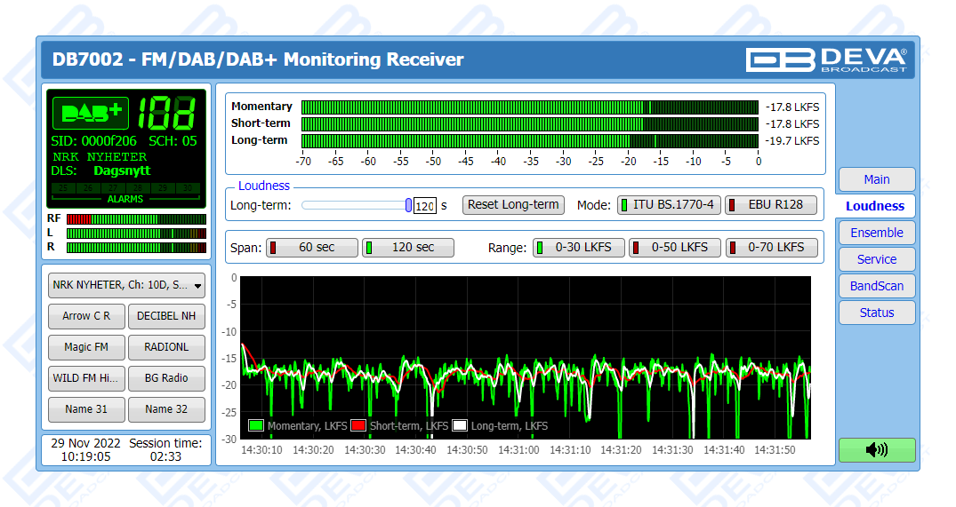 As an FM monitoring tool, DB7002 also provides powerful signal processing capabilities through sophisticated DSP algorithms and offers a Loudness Meter, which allows for measurements to be shown as defined by ITU BS.1770-4 and EBU R128 recommendations.