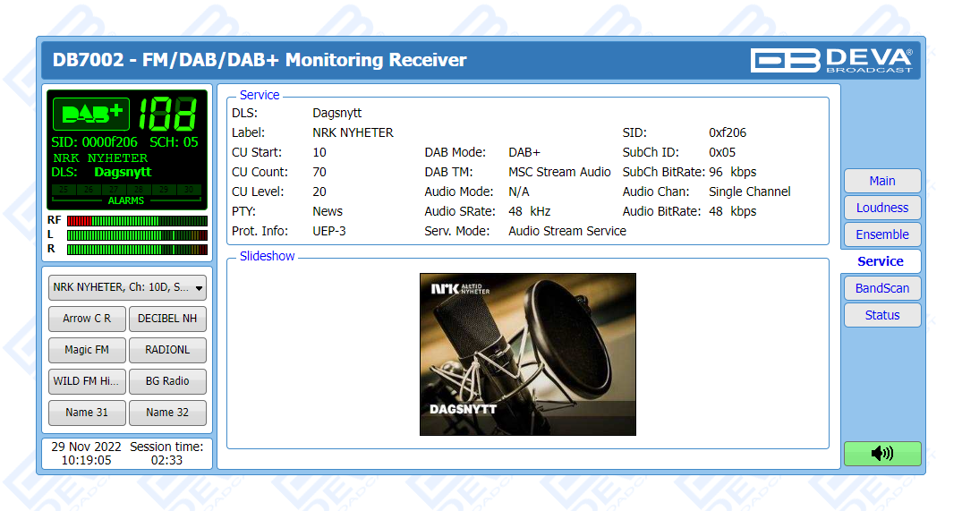 As a product that incorporates DAB/DAB+ monitoring capabilities, DB7002 fully meets the ETSI EN 300 401 DAB standard and offers support for Program Associated Data (PAD), as well as all standard bitrates and VBR, and automatically displays live metadata.