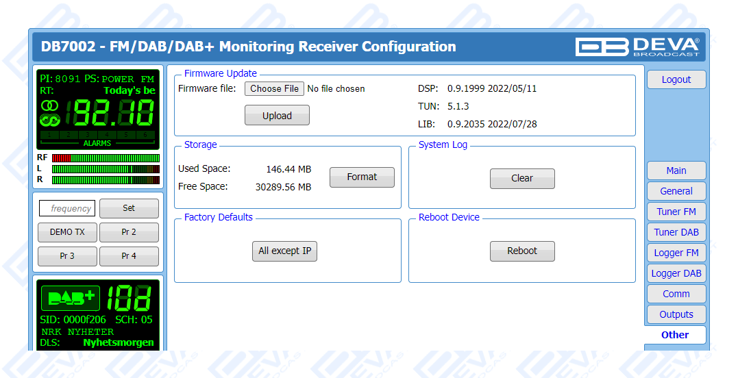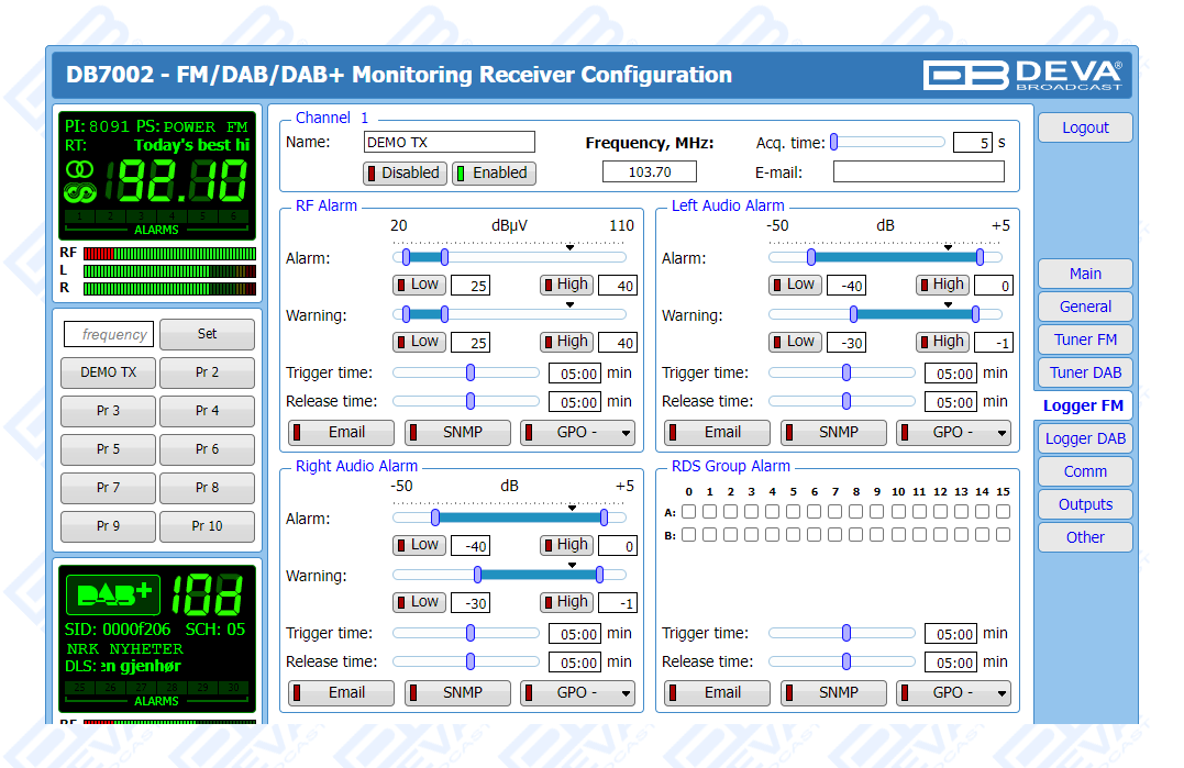 DB7002 is a revolutionary solution that combines in a single, high-precision tool the most important functionalities of two separate types of product. To achieve that, our engineers have equipped this model with two independent tuners - one for FM and one for DAB/DAB+, allowing for the device to perform both FM and DAB/DAB+ monitoring in parallel. It provides detailed and accurate measurement of all of the most important signal parameters and also boasts two loggers with 24 channels apiece for FM and DAB/DAB+. The recorded information is stored in log files on an SD card for easy future analysis and can easily be downloaded via a standard FTP client.