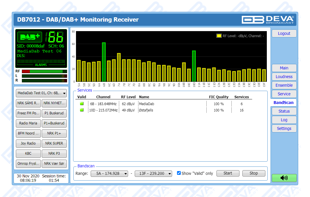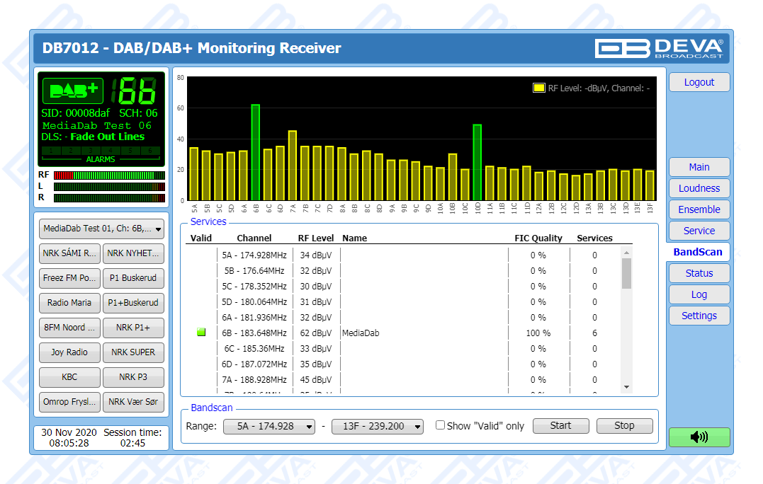 The BandScan function of the DB7012 presents an overview of all DAB/DAB+ signals available, plus their RF signal strength. BandScans are possible within any section of Band III. The generated spectrum diagram shows the RF Level vs. the channels.