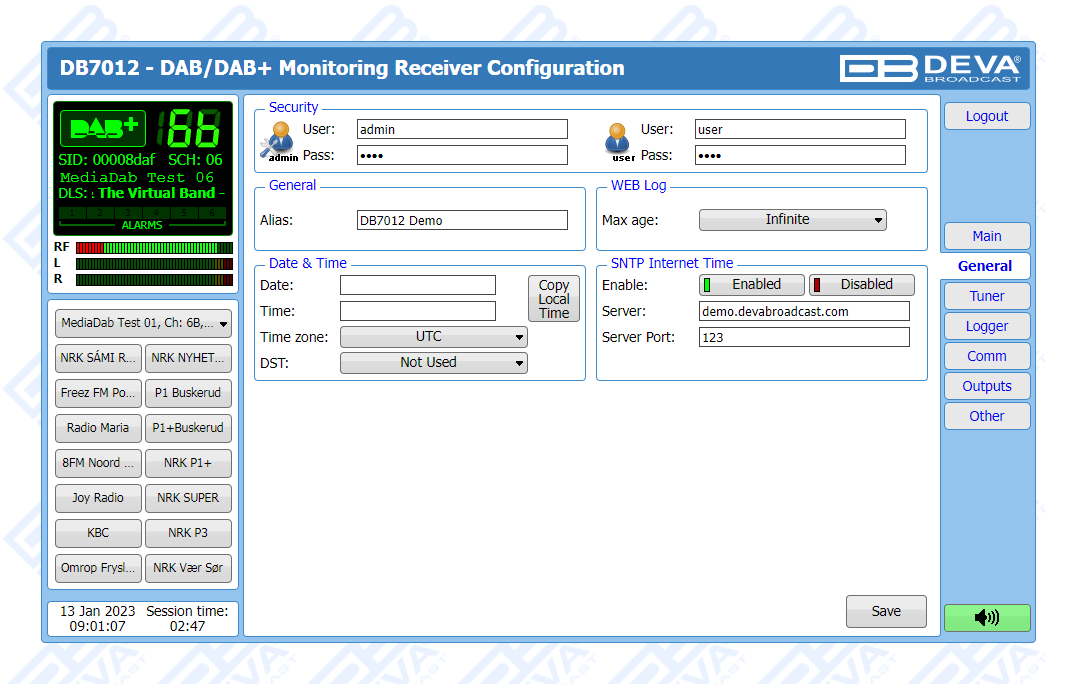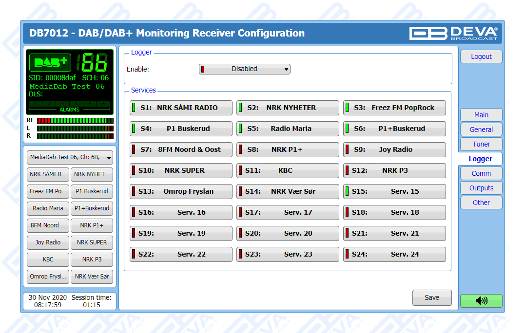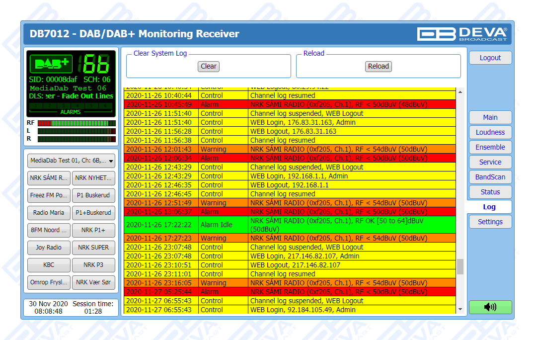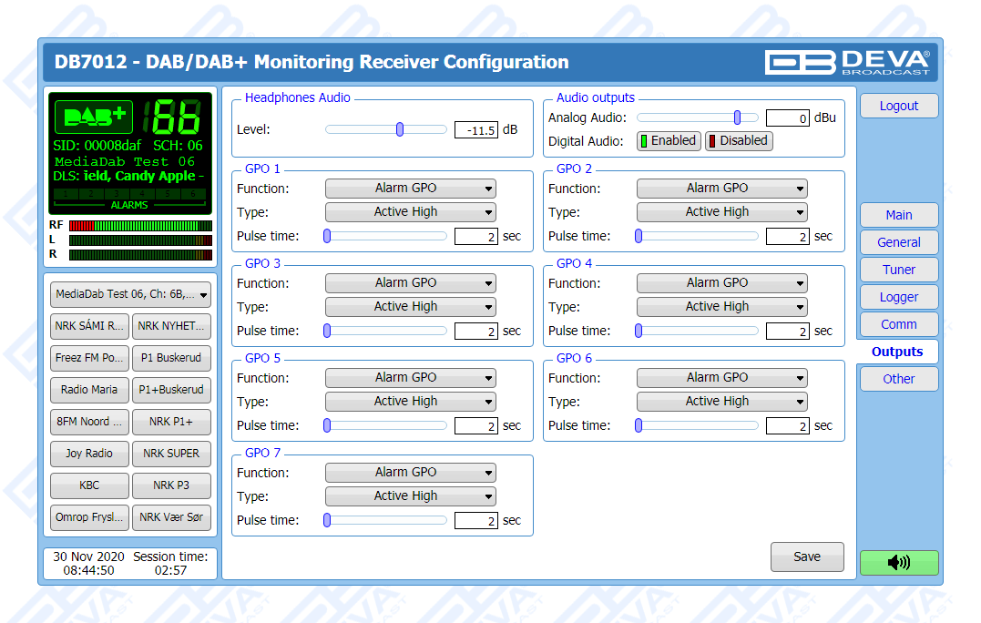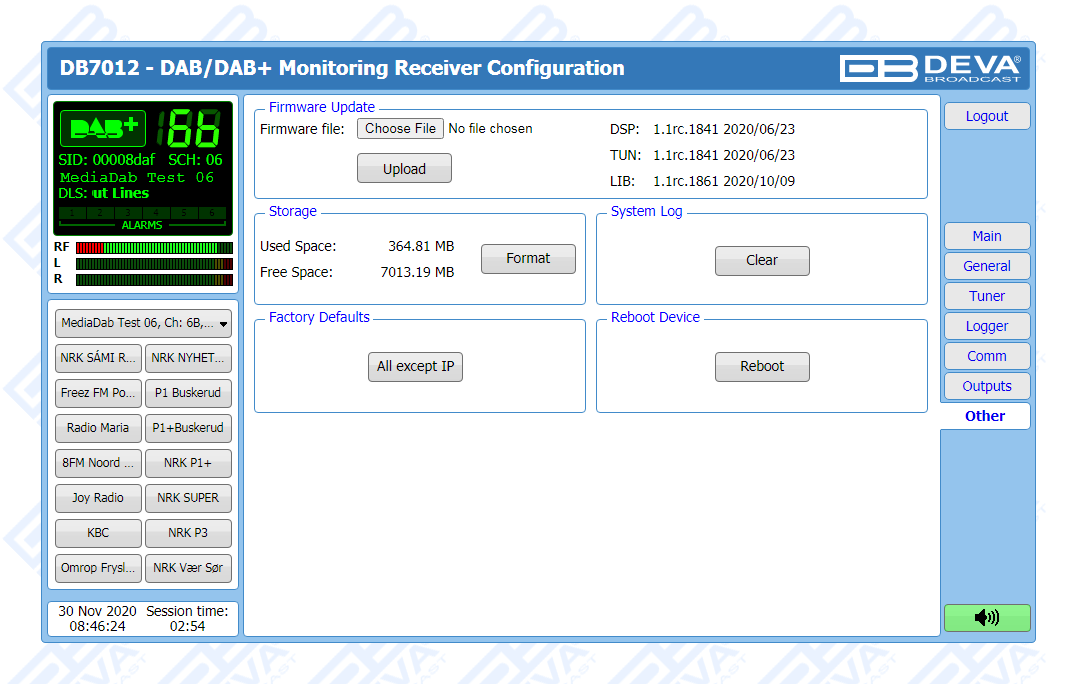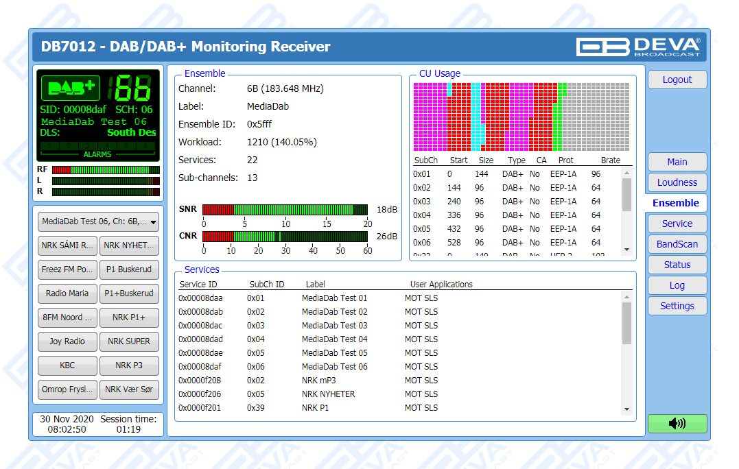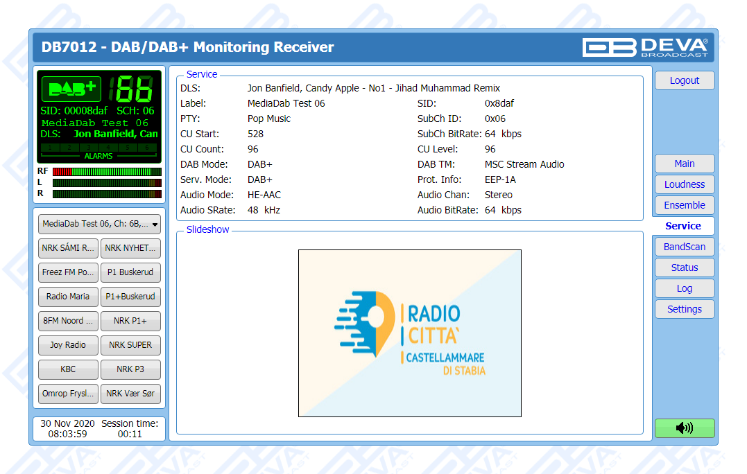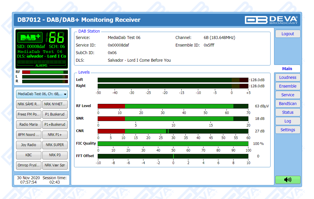 As a leading manufacturer of advanced broadcasting technology, it is DEVA’s aim to constantly supply top-of-the-range gear in keeping with the major industry trends, which is why our team has created a top-quality line of products dedicated to Digital Radio Broadcasting. As part of that line, the DB7012 fully meets the ETSI EN 300 401 DAB standard. Additionally, it offers support for Program Associated Data (PAD), as well as all standard bitrates and VBR and automatically displays live metadata. While the signal is being monitored and logged, the DB7012 measures the following DAB signals: RSSI, SNR, CNR, FIC Quality, FIB Errors, FFT Offset and the Left & Right Audio level values and stores them, thereby allowing for future analysis. The collected data can easily be downloaded via a standard FTP client. As an additional feature, the tool guarantees that there is no interruption of the broadcast signal. This is achieved through the provided local alarm options and online notifications via rear-panel alarm GPOs, E-mail and SNMP in case there is audio loss or change in the DAB signal and the Left and Right Audio Levels. Therefore, maintenance staff can be quick to respond and prevent prolonged signal loss.