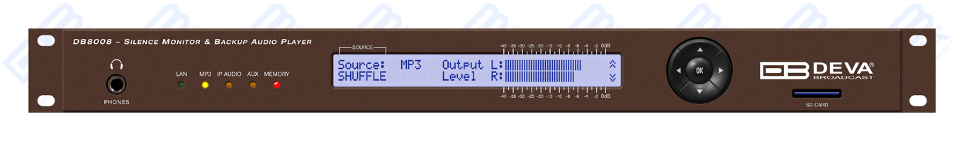 DB8008 has a built-in backup audio player. It plays tracks from SD Card storage uploaded over the FTP, in case of main audio signal loss.