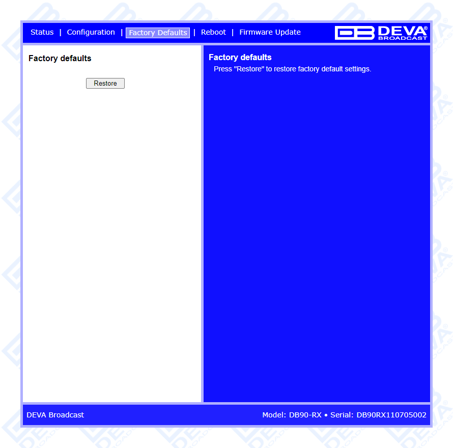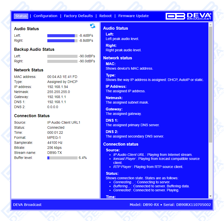 DB90-RX in combination with the HTML 5 based WEB Interface can be used for Broadcast, Internet Radio, Studio to Transmitter Link as well as VoIP applications. It is compatible with every online radio system, including Icecast and Shoutcast, and also supports low latency Real Time Protocol (RTP) connection.