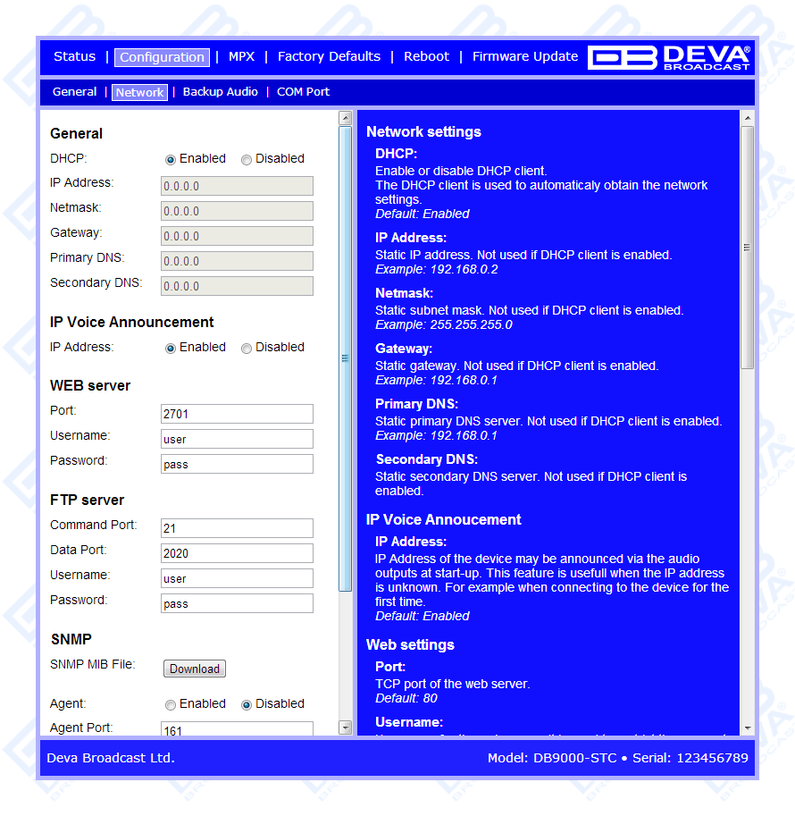 DB9000-STC is controlled trough a build in WEB Server and a standard web browser can be used to monitor its status or to make some adjustments. Once you have accessed the WEB Interface, in order for the needed adjustments to be made, go to Configuration section, then select Network subsection and disable the IP Voice announcement.