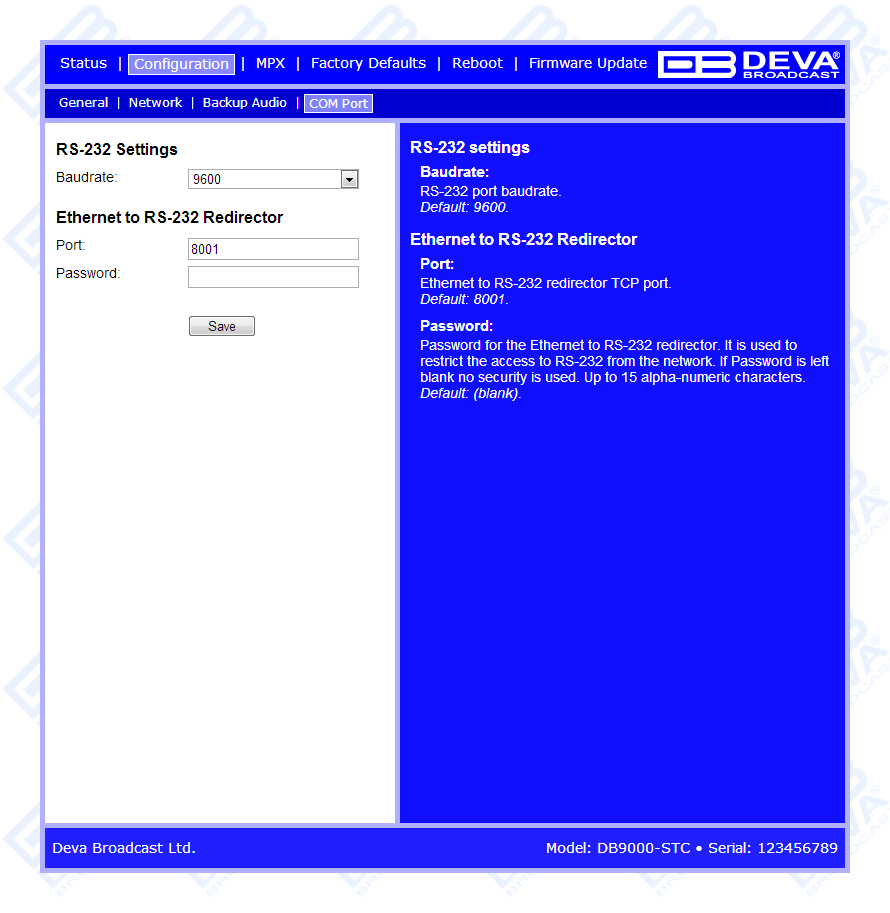 DB9000-STC is a high-performance, 32bits DSP based Stereo Generator with built-in RDS/RBDS encoder. It has been successfully designed to satisfy the most demanding requirements of FM Stereo generation and advanced RDS/RBDS encoding. This Stereo Encoder accepts both, Analog and Digital AES/EBU audio sources. DB9000-STC comes with an easy to use and password protected Web Server and a comprehensive remote control features. It supports SNMP, RS232, UDP, TCP/IP communication protocols. Its digital architecture guarantees long term reliability and easy firmware updates, directly on field or from remote.