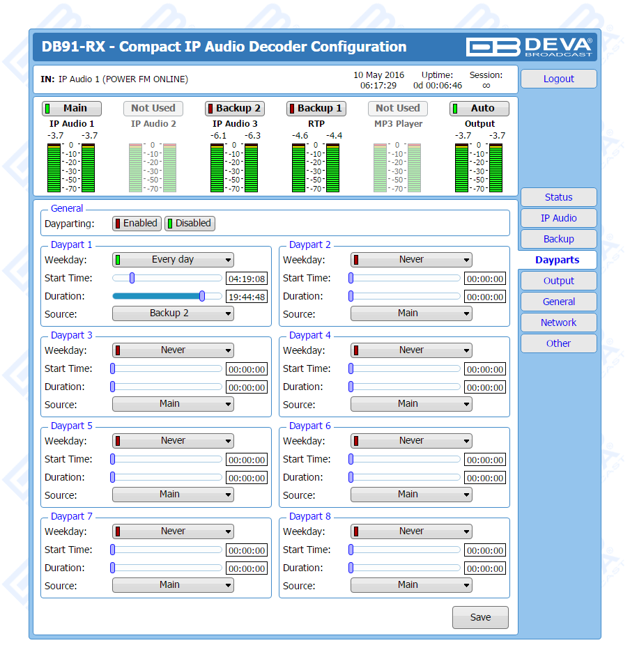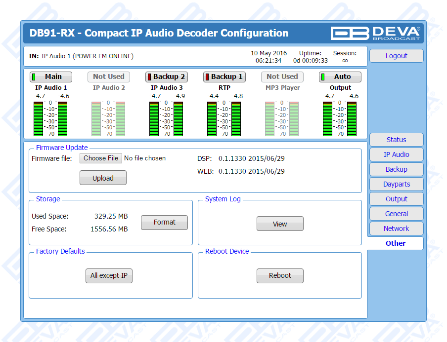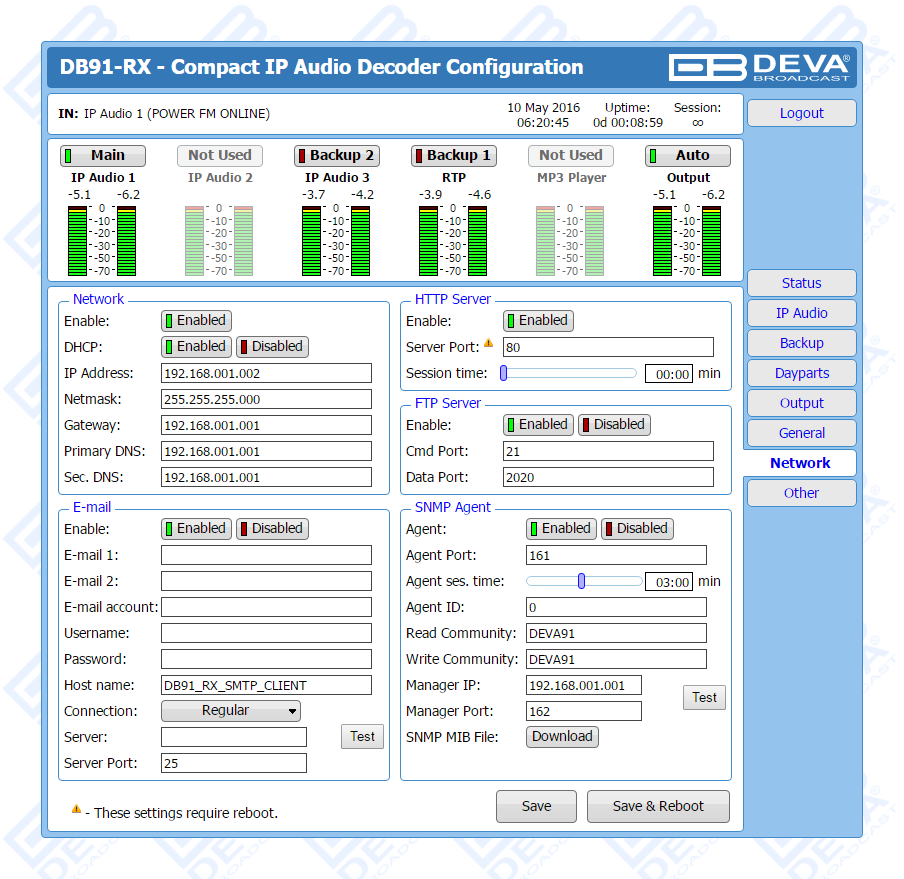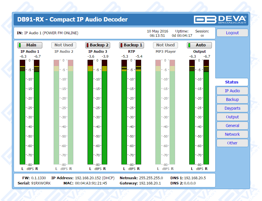 The DB91-RX is not only compatible with many online radio systems, Icecast and SHOUTcast included, but also supports low latency Real Time Protocol (RTP) connection. Controlled through a simple and intuitive HTML 5 based WEB Interface, the device can be used for Broadcast, Internet Radio, Studio to Transmitter Link, as well as VoIP applications. The DB91-RX IP audio decoder could be also set to work as a multicast RTP receiver, which makes it a particularly valuable asset when delivering audio to multicast groups.