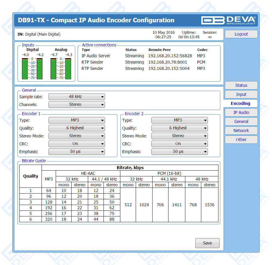 To unit ensures premium broadcasting experience as once the audio source is selected, the encoded in real time audio is immediately transmitted over IP-based networks. The enhanced DB91-TX can act simultaneously as an Icecast/Shoutcast compatible Server, Icecast source client or Real Time Protocol (RTP) sender. The audio stream can be spread over an IP-based network to one or more DB90-RX, DB91-RX or other compatible IP audio decoders. To address the evolving customer needs, the DB91-TX IP Audio Encoder can also send audio to a number of clients simultaneously, provided that a multicast address is being entered as a client address.