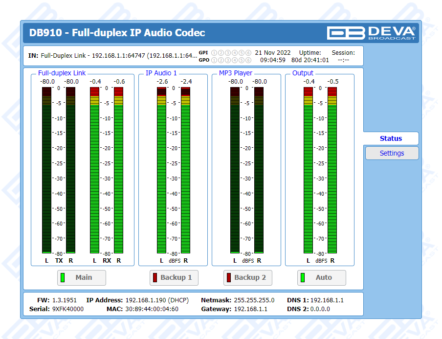 A full duplex solution when two tools are in use, the DB910 allows you to send and receive audio at the same time, while guaranteeing fast and easy monitoring of the signal fed to the transmitter. Where two-way transmission is not required, DB910 may be used as a decoder, being fully compatible with DEVA’s already widely-known hallmark IP audio codecs.