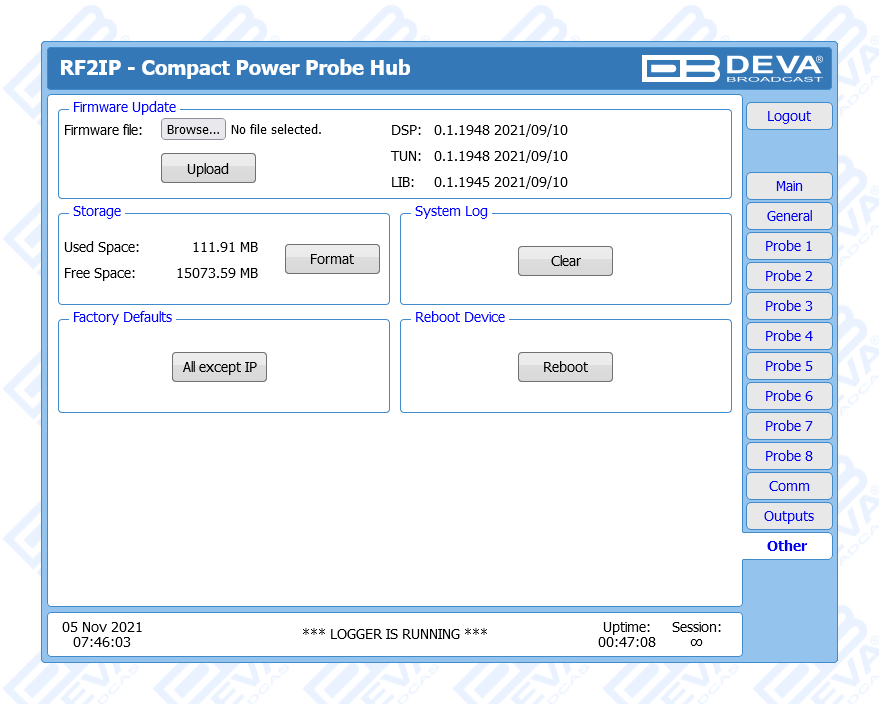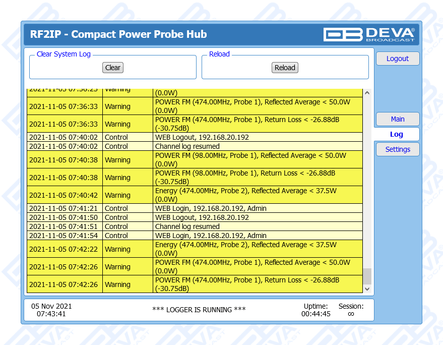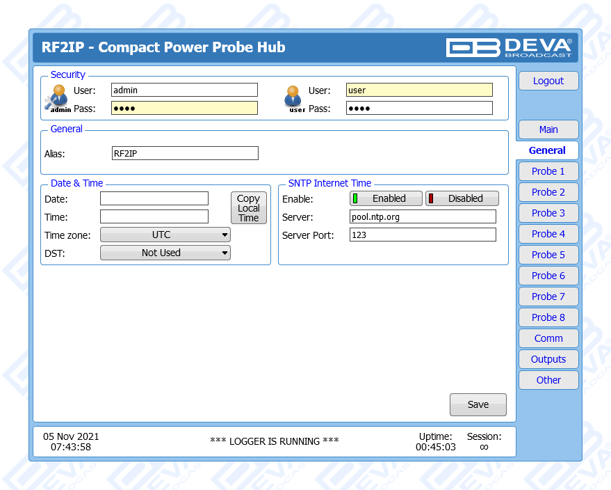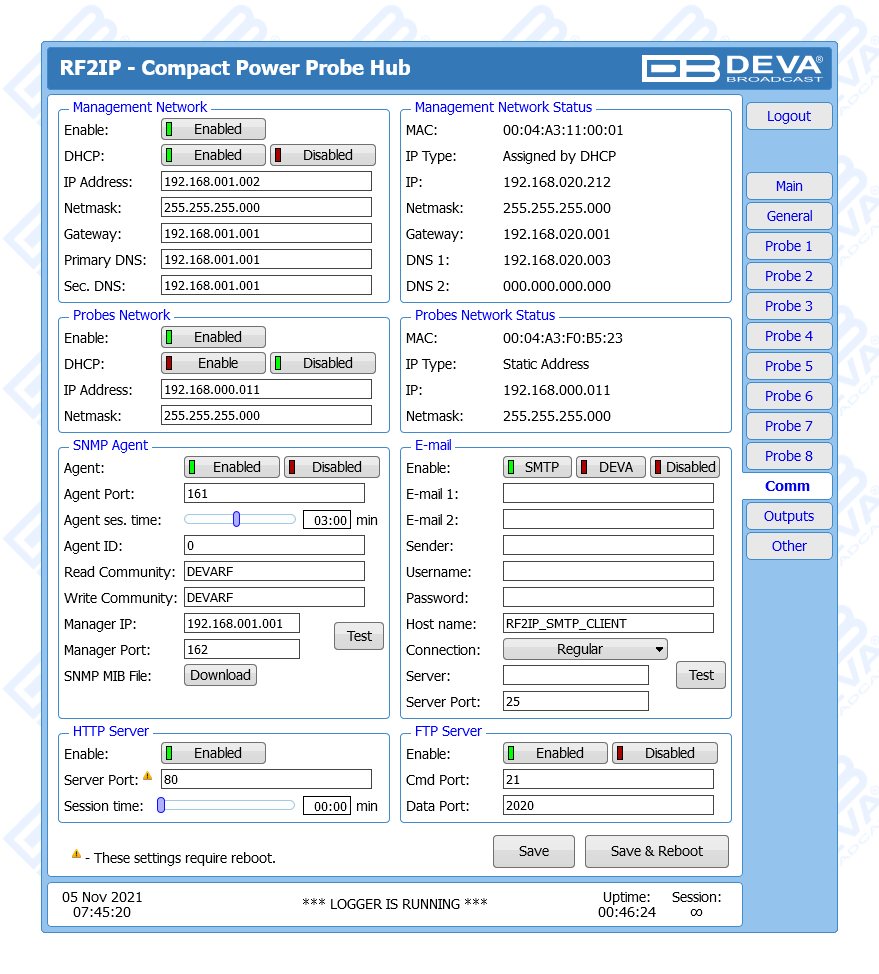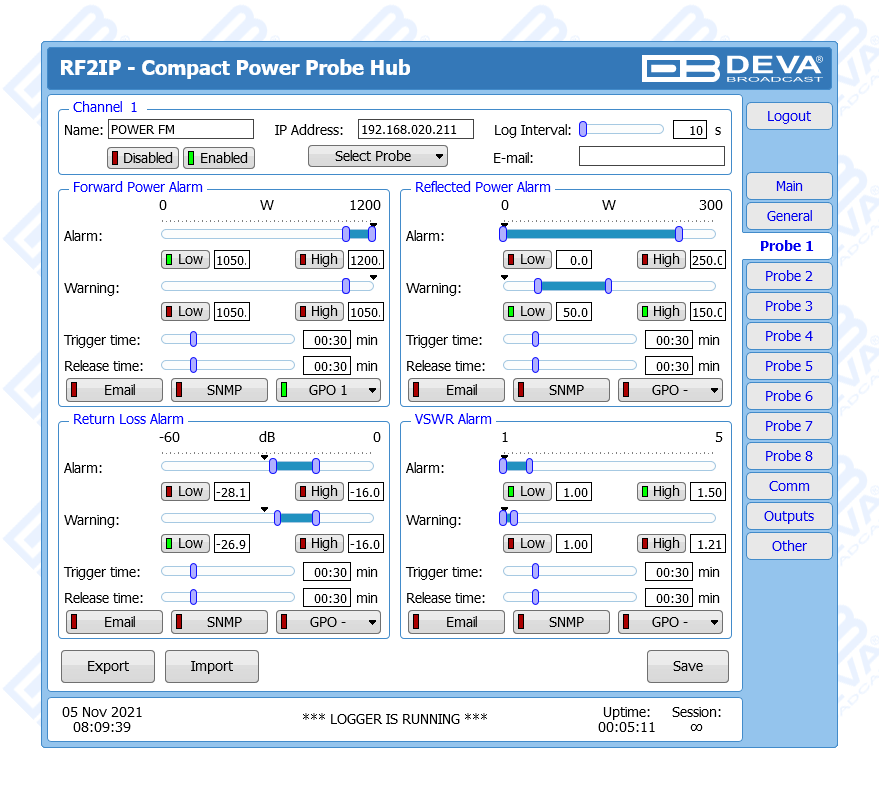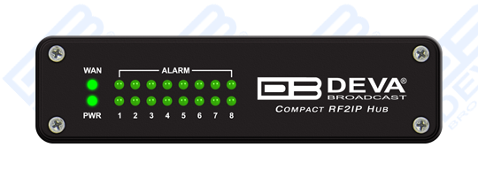 DEVA's Compact RF2IP Hub is a compact and elegant solution intended to be used with our RF2IP Digital RF Power Monitoring Probe, which allows you to collect, monitor and store the measurements of a network consisting of up to eight RF probes. A reliable product with a practical design, it comes with two LAN ports on the back panel - one specifically designated for effortless management and one for the RF probes network. The eighteen LEDs on the front panel are an informative and useful feature - these are intended for Power, LAN, as well as Connection Status and Alarm status for each RF2IP unit, while the 16GB SD card stores log files of all measurements and events. The product provides alarms for Forward Power, Reflected Power, Return Loss and VSWR for each probe. Alarm and Warning Thresholds are also available individually for each probe and each alarm. Alarm notifications can be sent via email and SNMP. The product also offers a battery backup of the real-time clock in case of power failure.