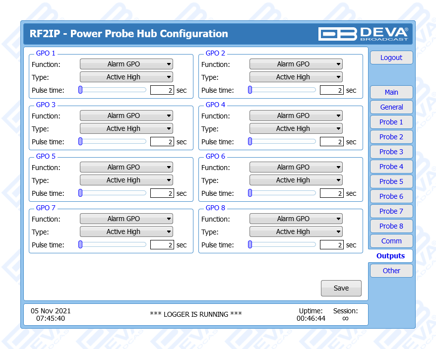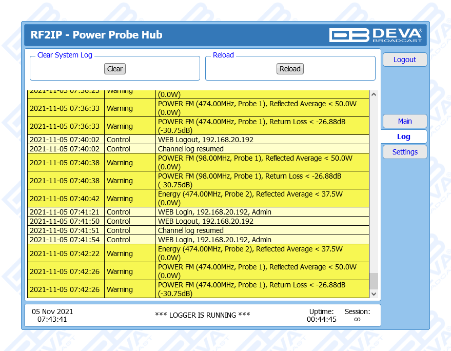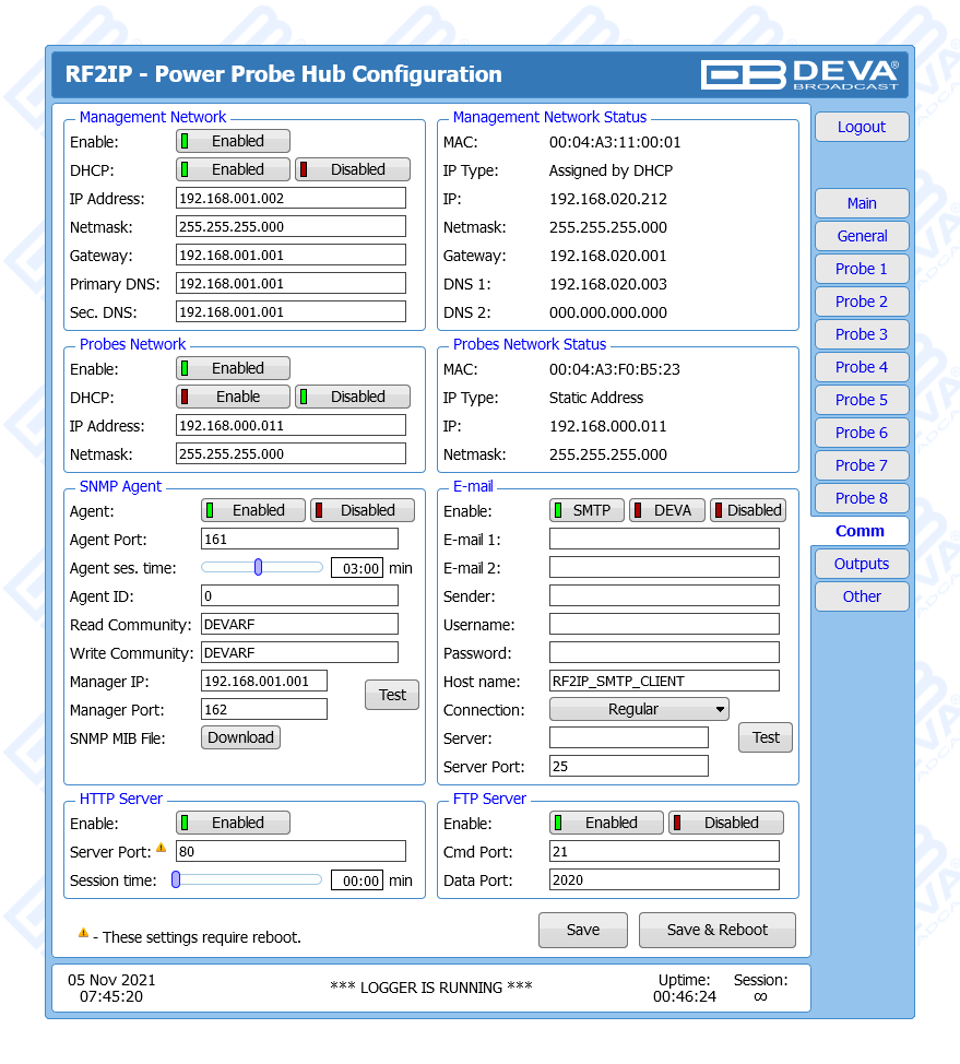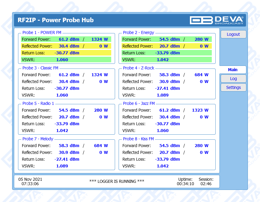 RF2IP Hub is a smart solution developed as a natural addition to our RF2IP Digital RF Power Monitoring Probe, which combines several important functions and allows you to simultaneously collect, monitor and store the measurements of a network consisting of up to eight RF probes. Extremely useful and highly dependable, this rack mountable tool comes with two LAN ports on the back panel - one specifically designated for effortless management and one for the RF probes network. The eighteen LEDs on the front panel are an informative and practical feature - these are intended for Power, LAN, as well as Connection Status and Alarm status for each RF2IP unit, while the 16GB SD card stores log files of all measurements and events. The product provides alarms for Forward Power, Reflected Power, Return Loss and VSWR for each probe. Alarm and Warning Thresholds are also available individually for each probe and each alarm. Alarm notifications can be sent via email, SNMP and GPO, with the GPO port on the back panel of the unit providing eight alarm GPOs. The product also offers a battery backup of the real-time clock in case of power failure.