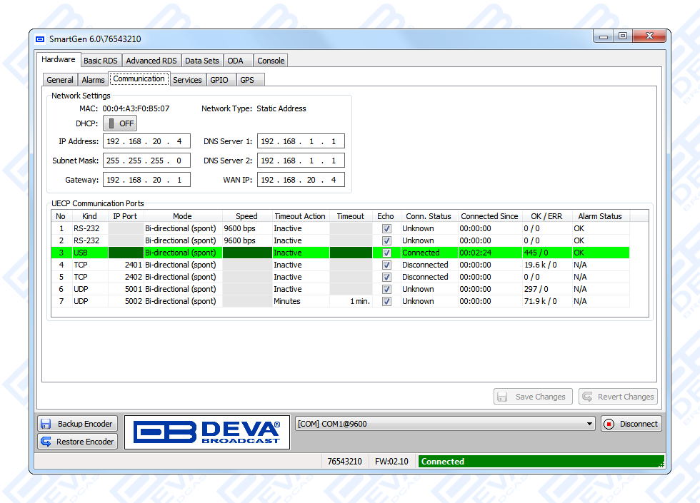 Since all DEVA’s products are manufactured to be user friendly in terms of operation, SmartGen 6 comes with simple and reliable programming software: “SmartGen RDS/RBDS Encoders Manager” and a password protected WEB interface for remote connection.